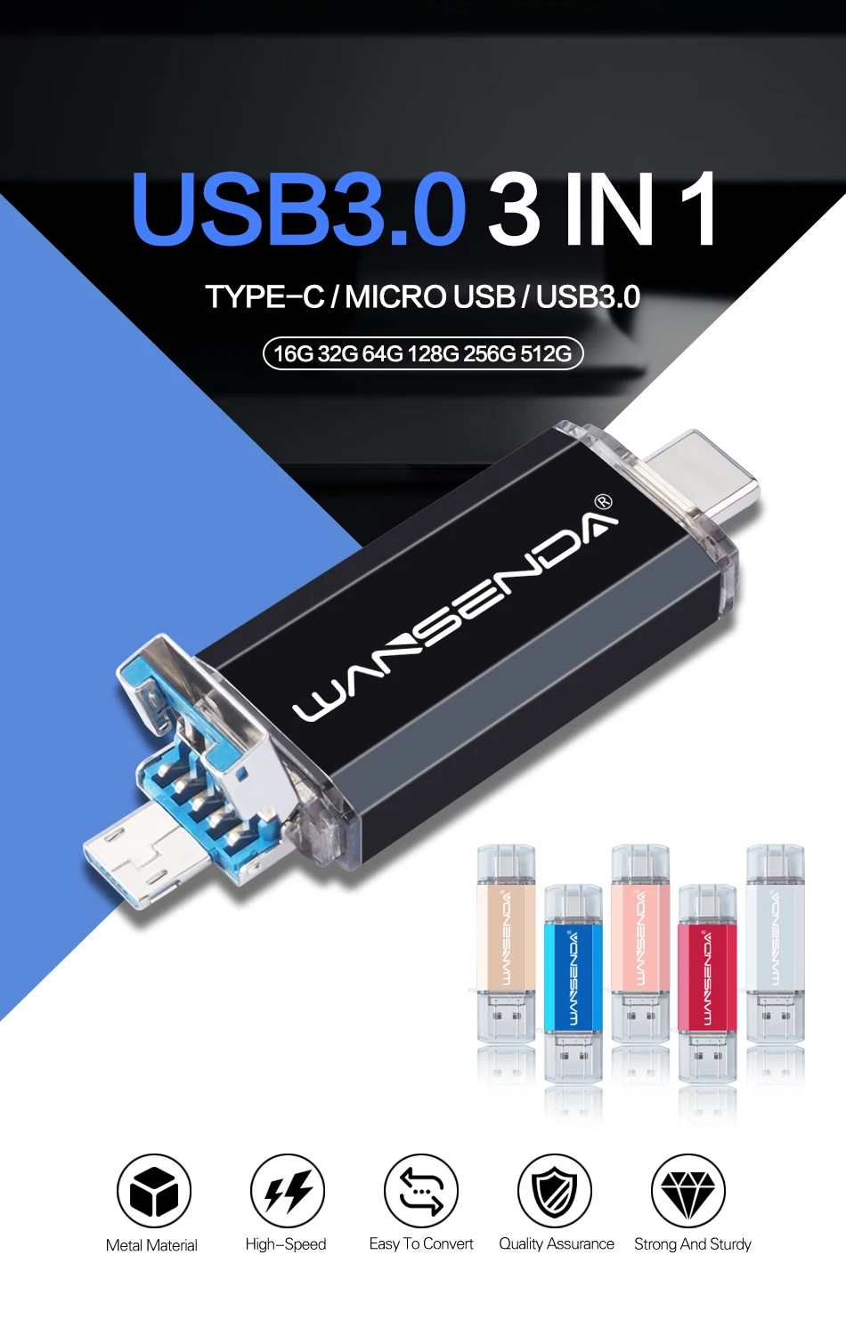 Comprar WANSENDA 3 en 1 unidad flash OTG USB 3,0/USB TIPO C/Micro USB Pen Drive 32GB USB Stick 3,0 64GB 128GB 256GB 512GB Pendrive