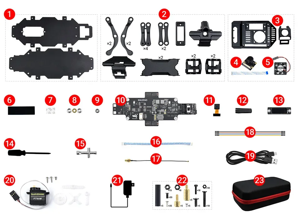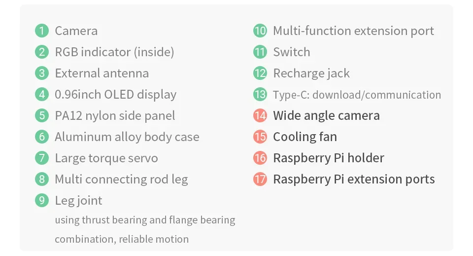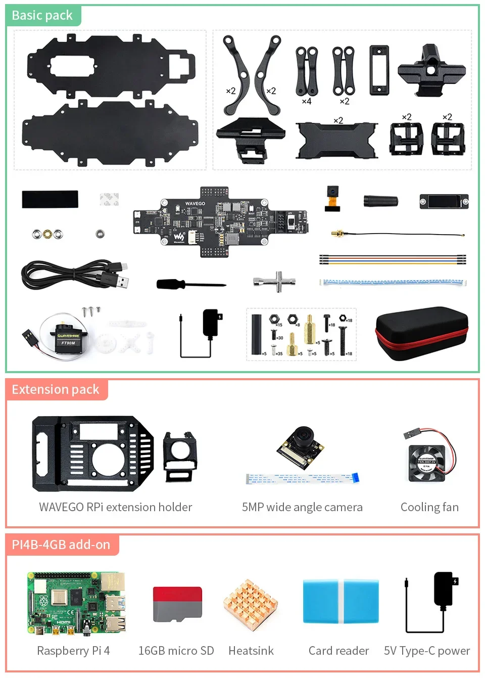 Se puede conectar Raspberry Pi adicional como controlador principal para habilitar funciones de alto nivel OpenCV, códigos de demostración que incluyen reconocimiento facial, detección de movimiento, seguimiento de colores y más.Interfaz de extensión reservada para desarrollo secundario, junto con manual de usuario y documentos de desarrollo secundario.