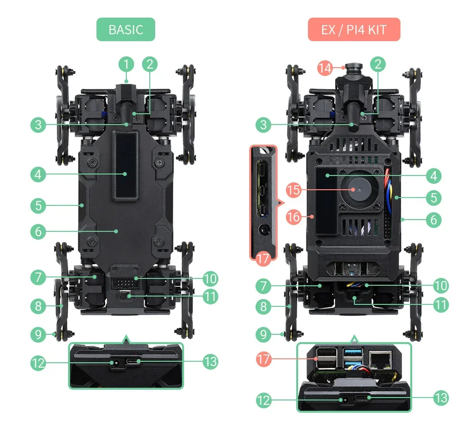 ElWAVEGOes un robot biónico tipo perro de alto DOF que cuenta con 2.3kg.Servos de torsión grande en cm, estructura confiable y movimiento flexible, que incorporan dispositivos como cámara frontal, rastreador de movimiento de 9 ejes, indicador RGB, etc., junto con la aplicación web multiplataforma de código abierto.Utiliza el ESP32 como subcontrolador para la resolución inversa de la biela y la generación de marcha, compartiendo la tarea de cálculo para el controlador del host, se puede conectar una Raspberry Pi adicional como controlador de host para una operación de decisión de alto nivel.