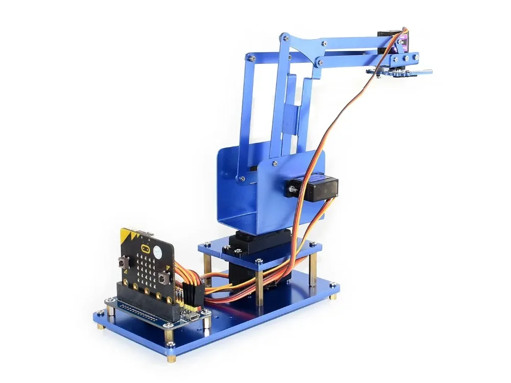 Este kit de brazo robótico de arranque incluye: placa de servocontrolador, estructura de brazo mecánico de metal y 4 servos de engranaje metálico.Cuando se usa con micro:bit, es fácil controlar el brazo mediante un teléfono inteligente a través de una conexión Bluetooth.