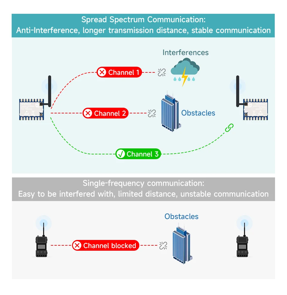 Admite esquemas de modulación LoRa, (G)FSK y LR-FHSS, compatible con las series SX126X/SX127X para actualizar fácilmente el producto