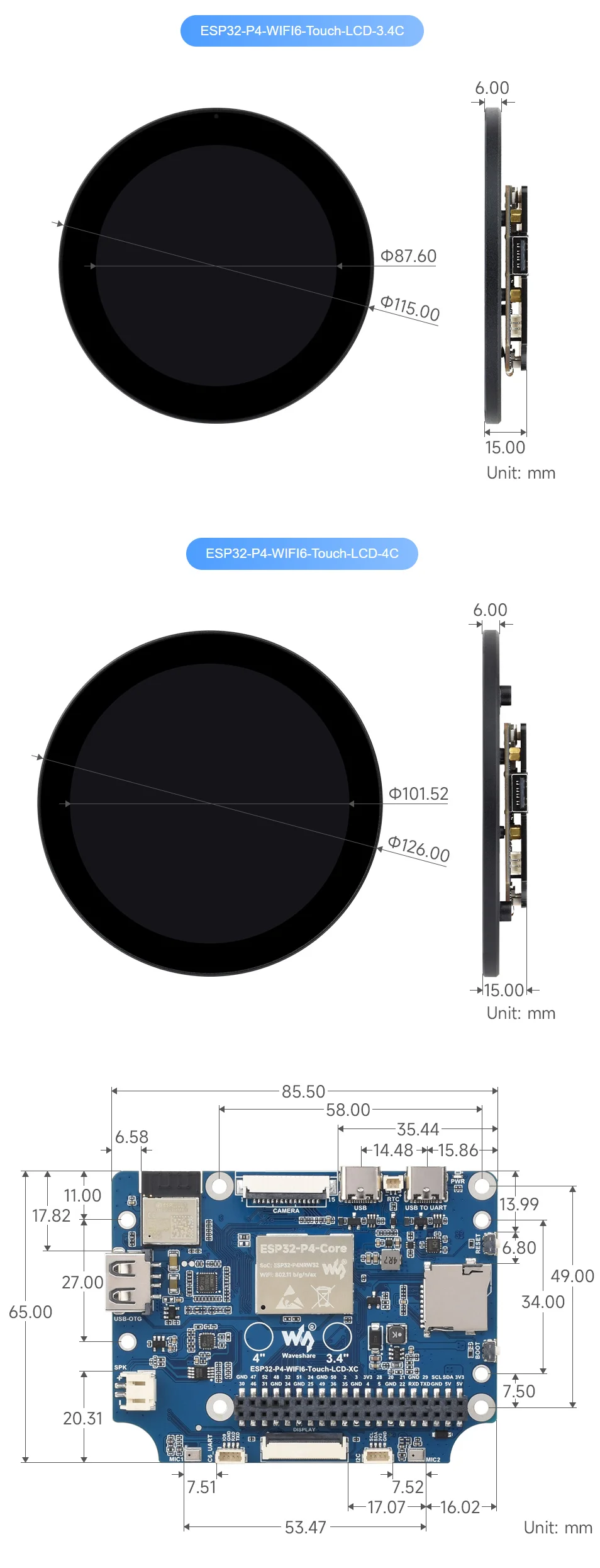 Comprar Waveshare ESP32-P4 WIFI6 Pantalla redonda LCD de 3,4 pulgadas Pantalla táctil de 4 pulgadas Micrófonos duales compatibles con Wi-Fi 6 / Bluetooth 5 (LE)