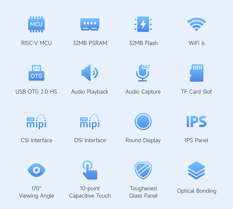 Este producto es una placa de desarrollo de alto rendimiento basada en el controlador ESP32-P4 con procesadores de doble núcleo y un solo núcleo RISC-V de 32 bits.Opciones para la versión de pantalla táctil redonda IPS de 3,4 pulgadas, 800 × 800 y la versión de pantalla táctil redonda de 4 pulgadas, 720 × 720 IPS.Cuenta con ricas interfaces Human-Machine que incluyen MIPI-CSI (con procesador de señal de imagen integrado) y admite USB OTG 2.0 HS para comunicaciones de alta velocidad.Conector GPIO de 40 pines integrado que es compatible con algunos HAT Raspberry Pi, lo que permite una gama más amplia de adaptabilidad de aplicaciones.