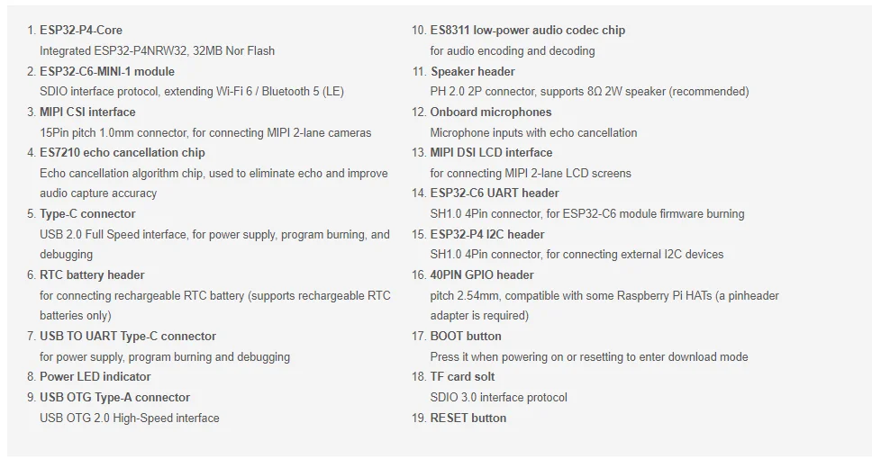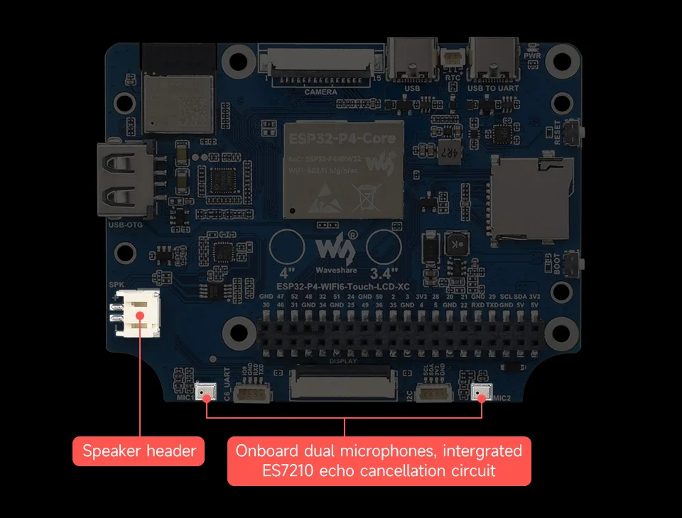Periféricos de uso común como MIPI-CSI, MIPI-DSI, USB 2.0 OTG HS, ranura para tarjeta SDIO 3.0 TF, micrófonos duales (compatible con cancelación de eco), cabezal de altavoz y cabezal de batería RTC, etc.