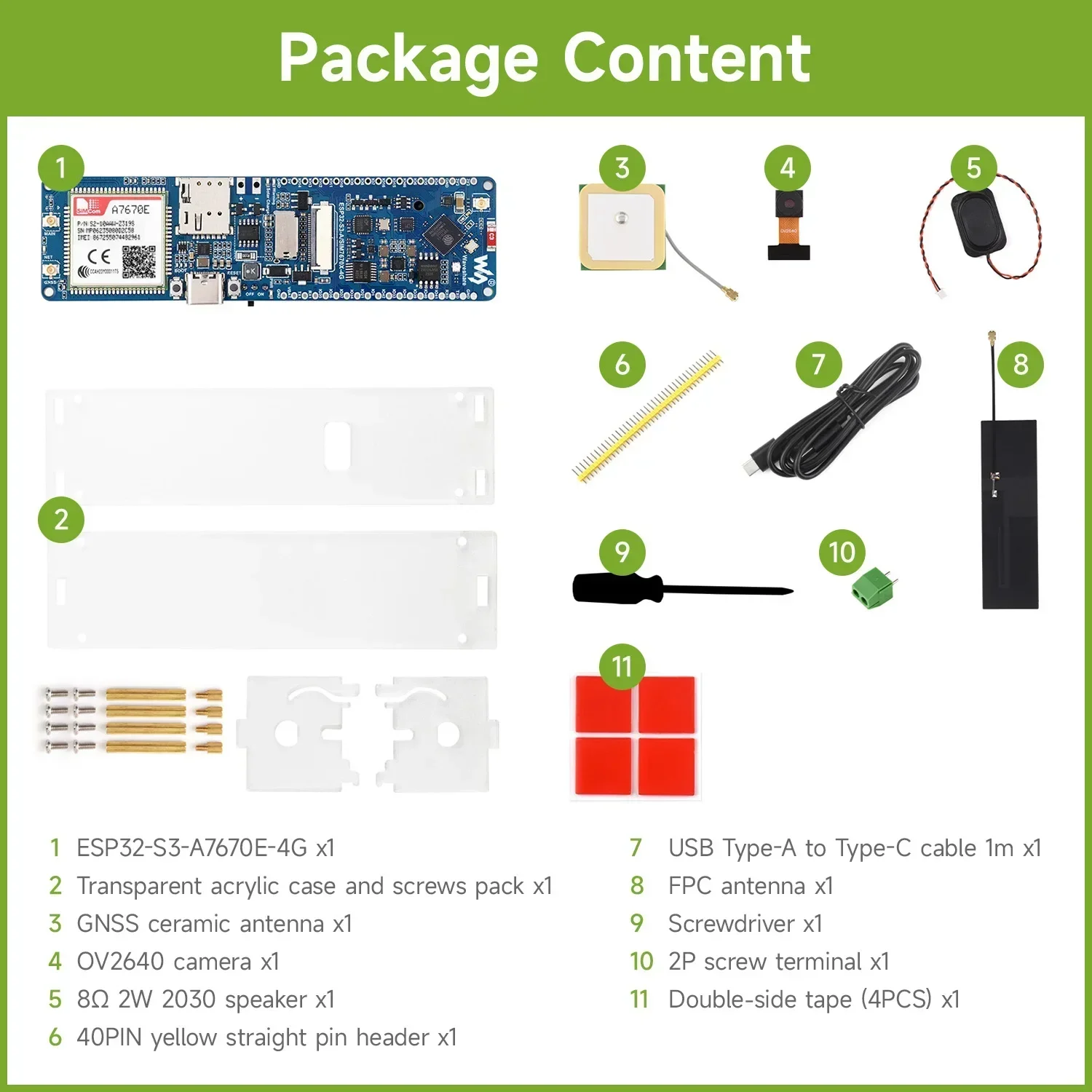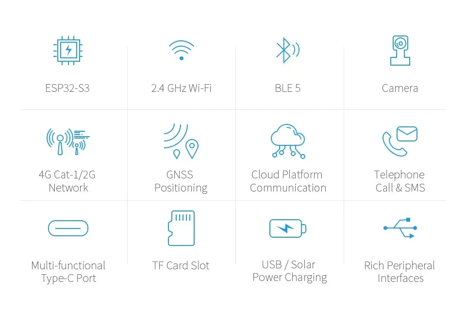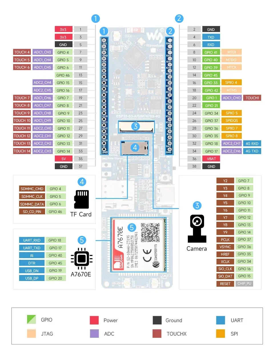 Prohibido por el fabricante de módulos SIMCOM, no podemos enviar este producto ni brindar soporte técnico a los siguientes países/regiones: Irán, Corea del Norte, Cuba, Sudán, Syrian.Placa de desarrollo ESP32-S3 A7670E 4G, LTE Cat-1/2G/WiFi/Bluetooth/llamada telefónica/SMS/GNSS soporte de posicionamiento, adecuada para WiFi portátil 4G, cámara integrada/altavoz/antenaBasado en ESP32-S3, integra módulo A7670E 4G, cámara y ranura para tarjeta TF, etc.