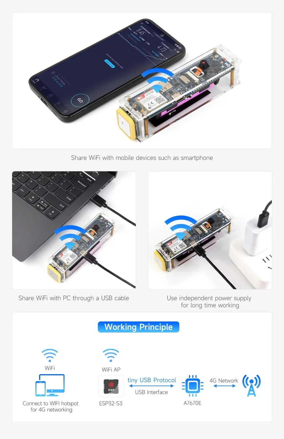 ESP32-S3 se conecta al A7670E a través de USB para habilitar la red 4G mientras activa simultáneamente el punto de acceso WiFi AP, lo que permite que los teléfonos inteligentes u otros terminales WiFi se conecten y accedan a la red