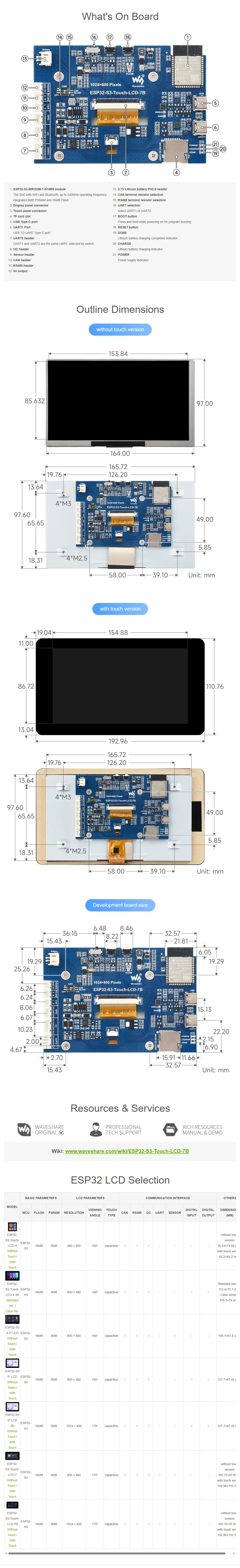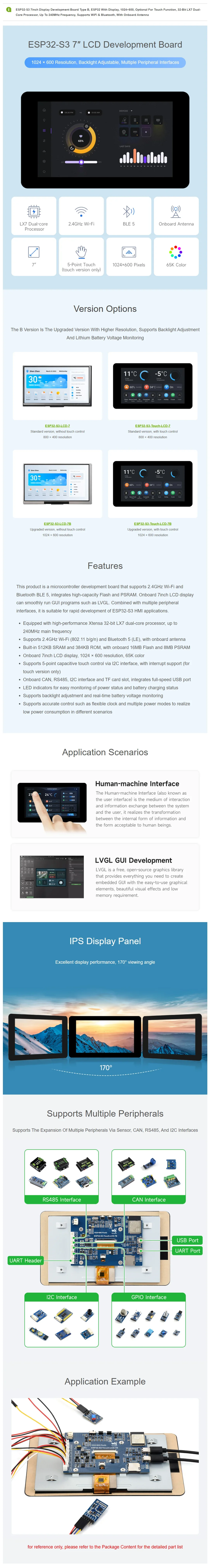 Comprar Waveshare ESP32-S3 Pantalla de 7 pulgadas tipo B con pantalla 1024 × 600 LX7 de 32 bits, opcional para función táctil