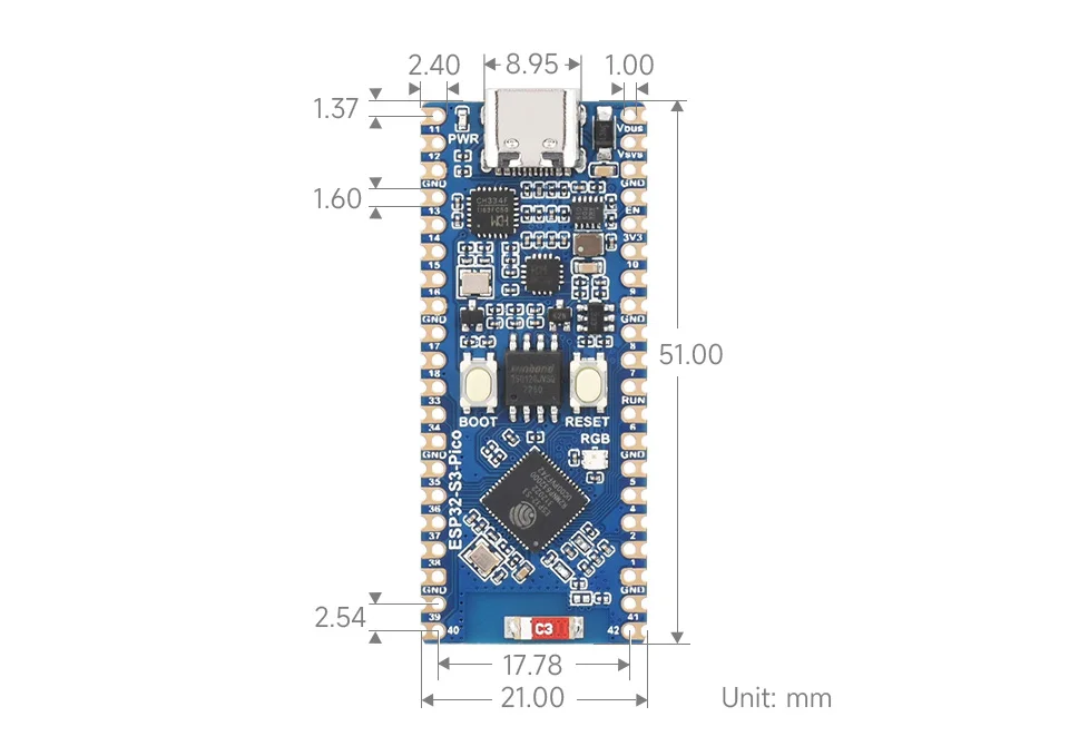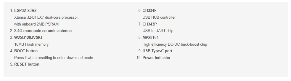 Adopta ESP32-S3R2 como chip principal, que está equipado con un procesador LX7 de 32 bits Xtensa de doble núcleo con frecuencia de funcionamiento de 240 MHz, con SRAM (TCM) incorporada de 512 KB y PSRAM de 2 MB;Chips CH343 y CH334 integrados para desarrollo USB y UART a través del puerto USB-C;Chip buck-boost DC-DC de alta eficiencia MP28164 integrado con corriente de carga de hasta 2A, lo que garantiza la seguridad del producto.