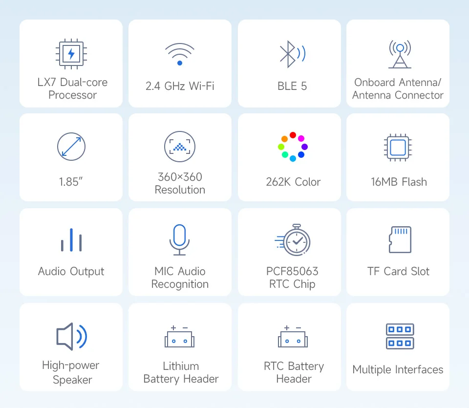 Decodificador de audio integrado, micrófono, sensor RTC, ranura para tarjeta TF y módulo de gestión de recarga de batería, etc.