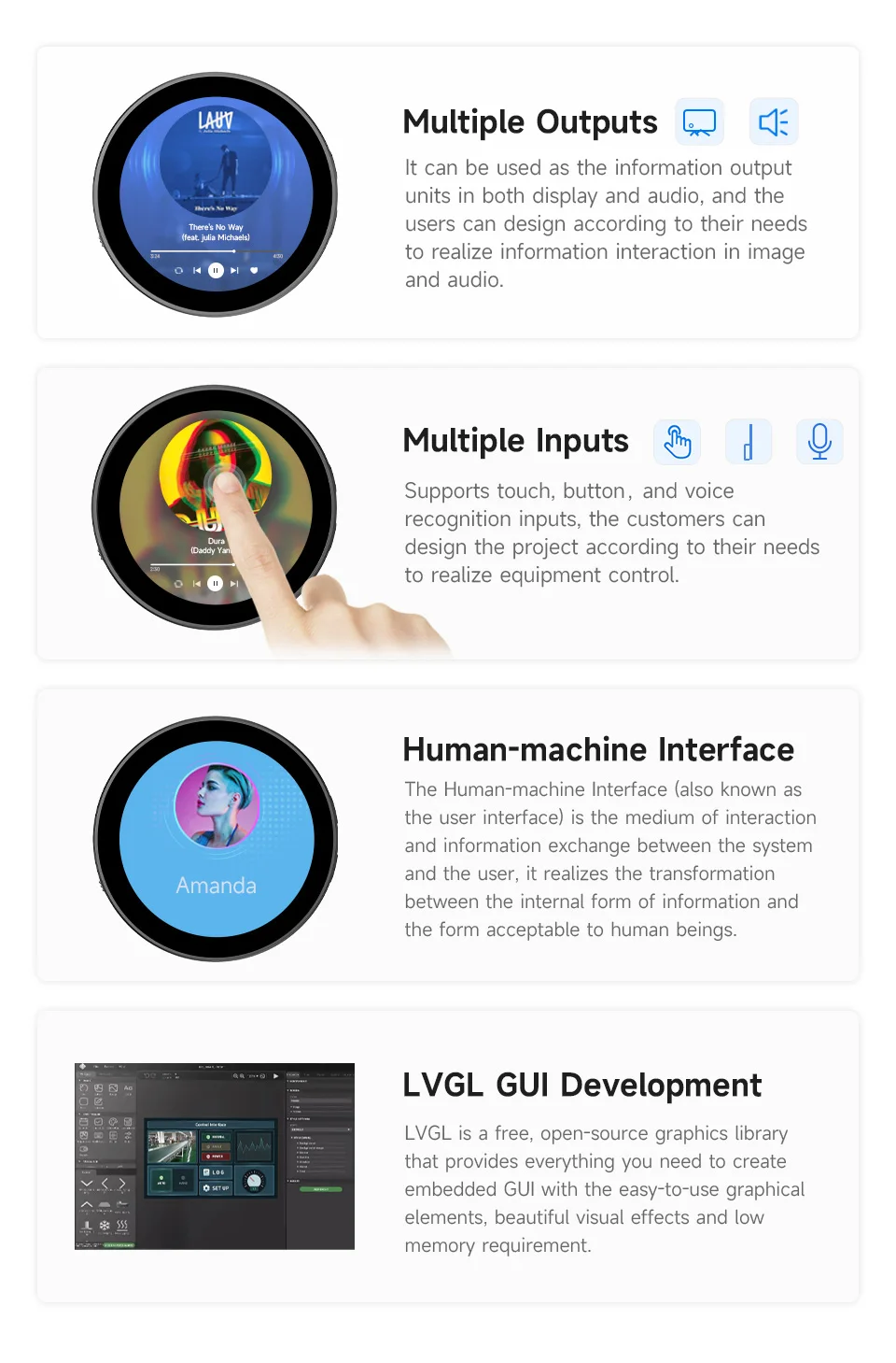 Admite la función táctil capacitiva controlada a través de la interfaz I2C para un funcionamiento flexible y una interacción de interfaz de usuario fluida, con soporte de interrupción