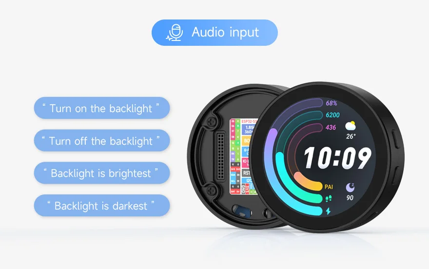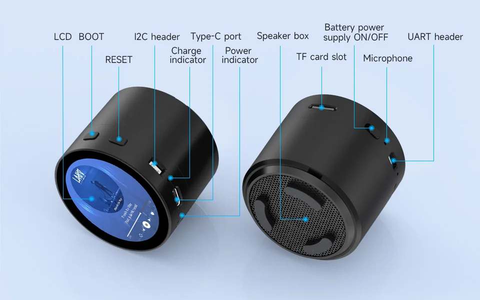 Decodificador de audio integrado, micrófono, sensor RTC, ranura para tarjeta TF y módulo de gestión de recarga de batería, etc.