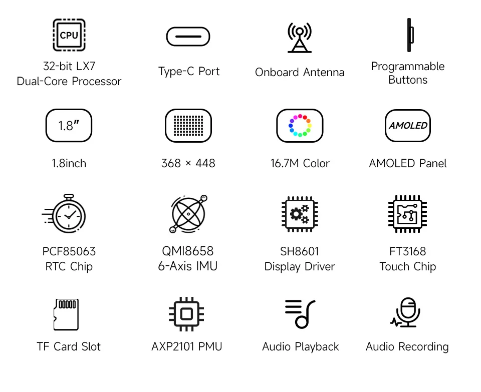 IMU integrada de 6 ejes QMI8658 (acelerómetro de 3 ejes y giroscopio de 3 ejes) para detectar gestos de movimiento, conteo de pasos, etc.