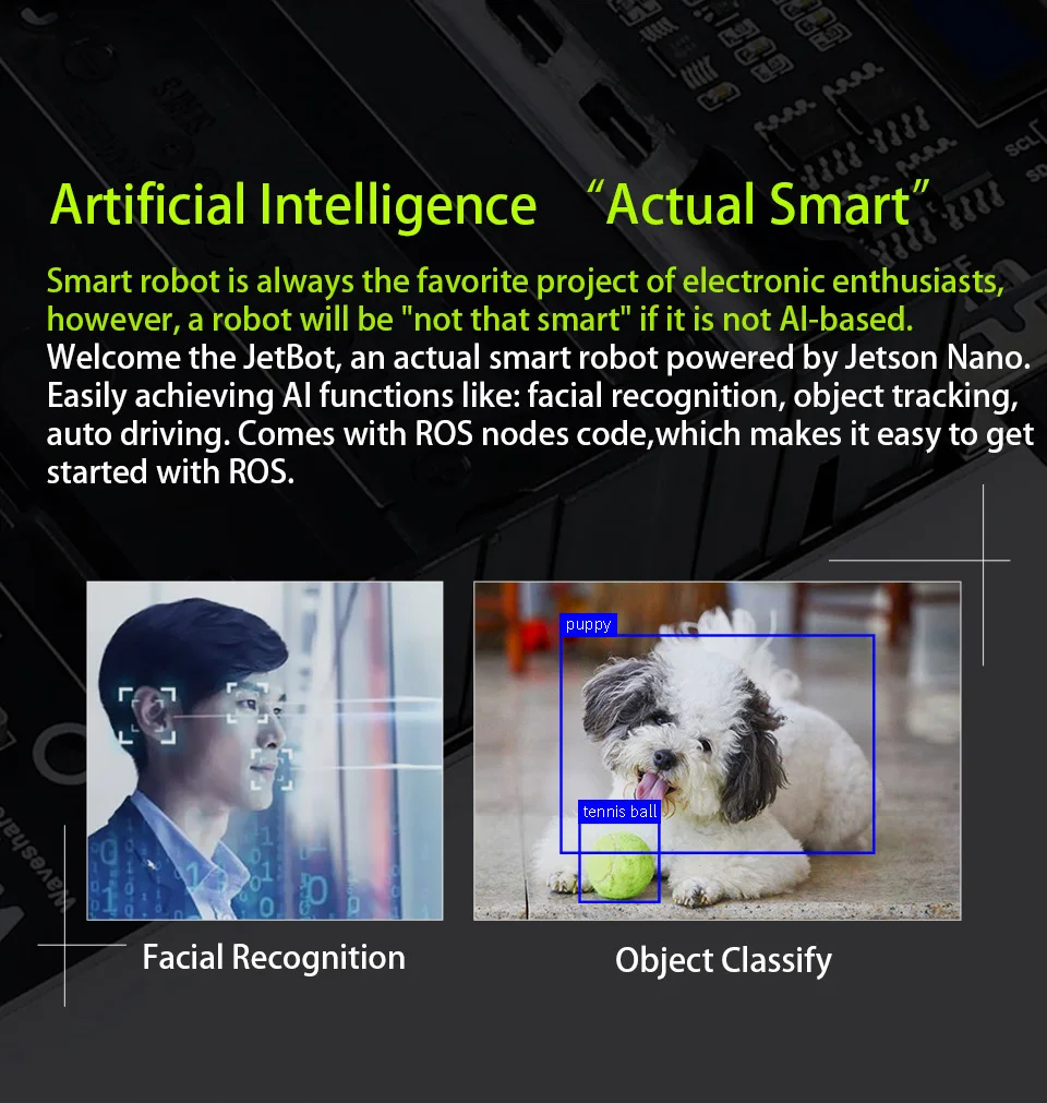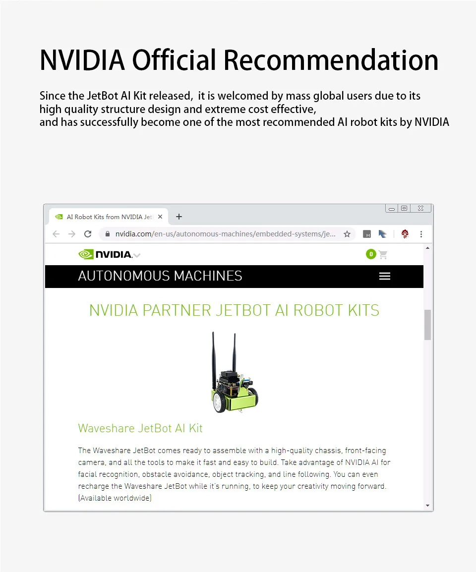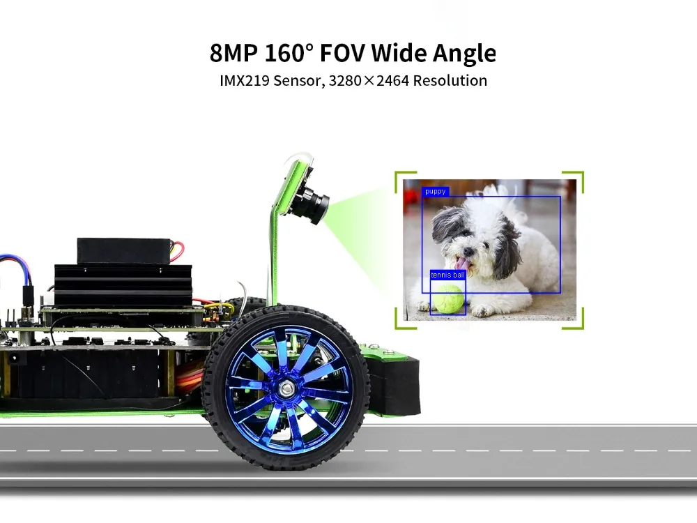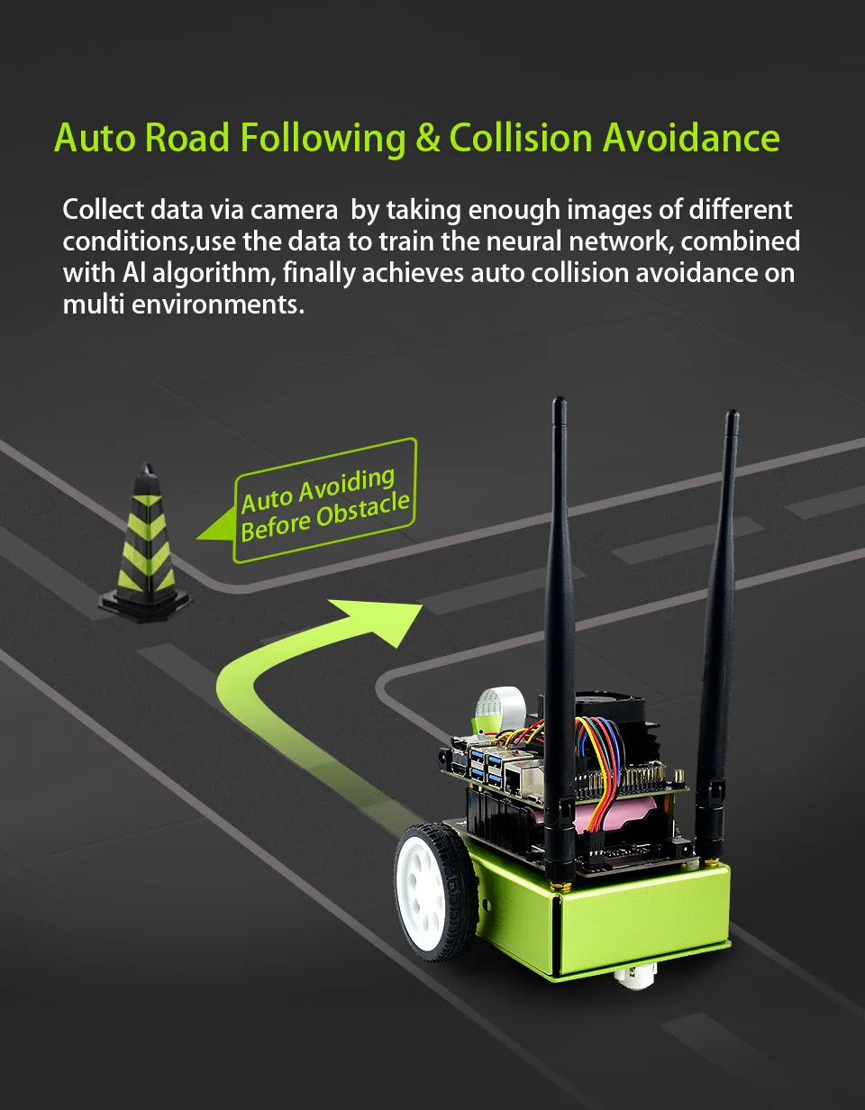 Dé la bienvenida al JetBot, un robot inteligente real impulsado por Jetson Nano.Con el ojo inteligente (cámara frontal), se puede lograr fácilmente el reconocimiento facial, el seguimiento de objetos, el seguimiento automático de líneas y la prevención de colisiones.También viene con el código de nodos ROS, lo que facilita comenzar con ROS (Robot Operating System) de código abierto y aprender el marco del sistema y los conceptos de ROS.
