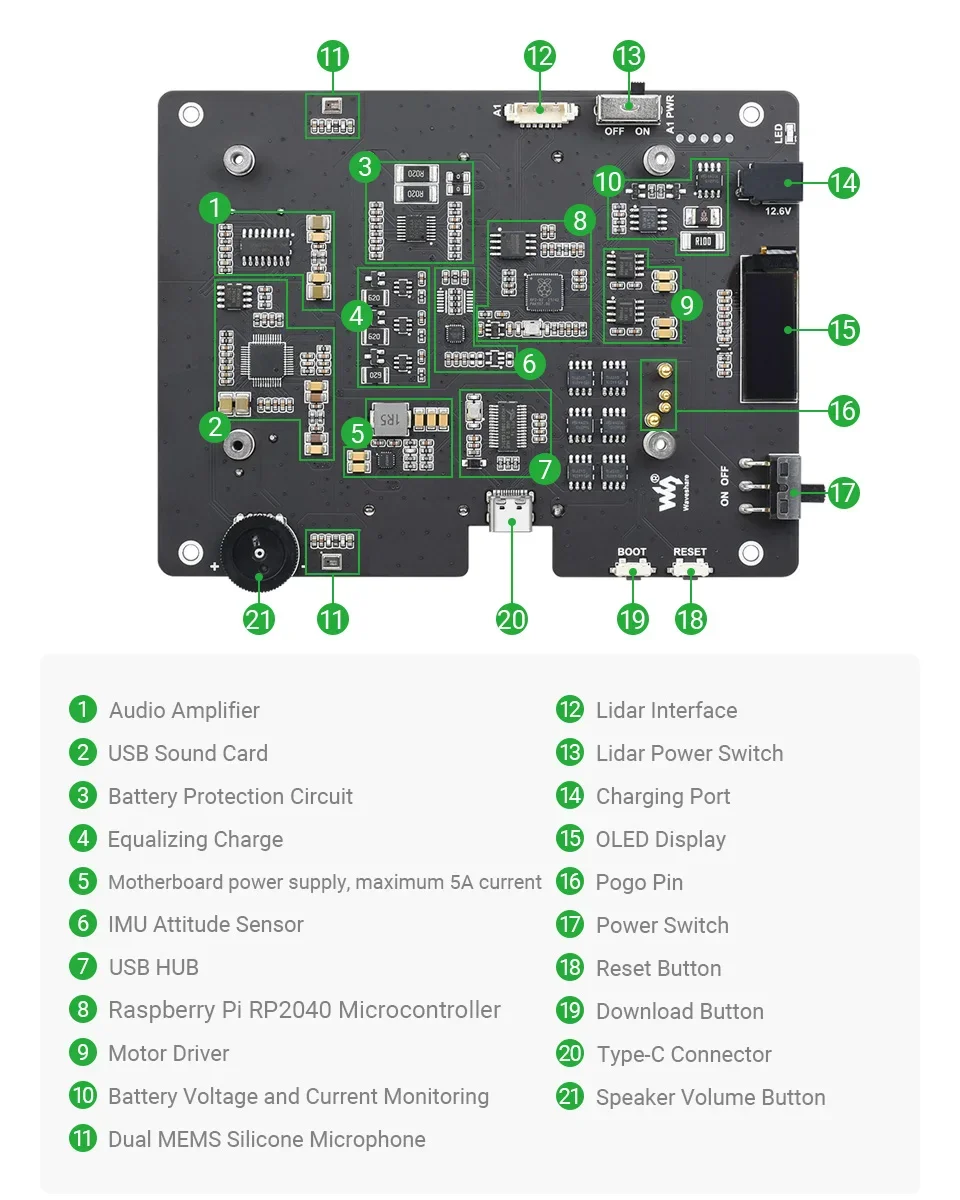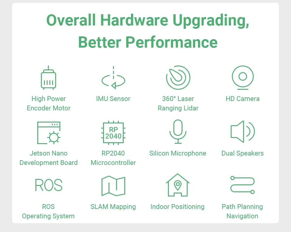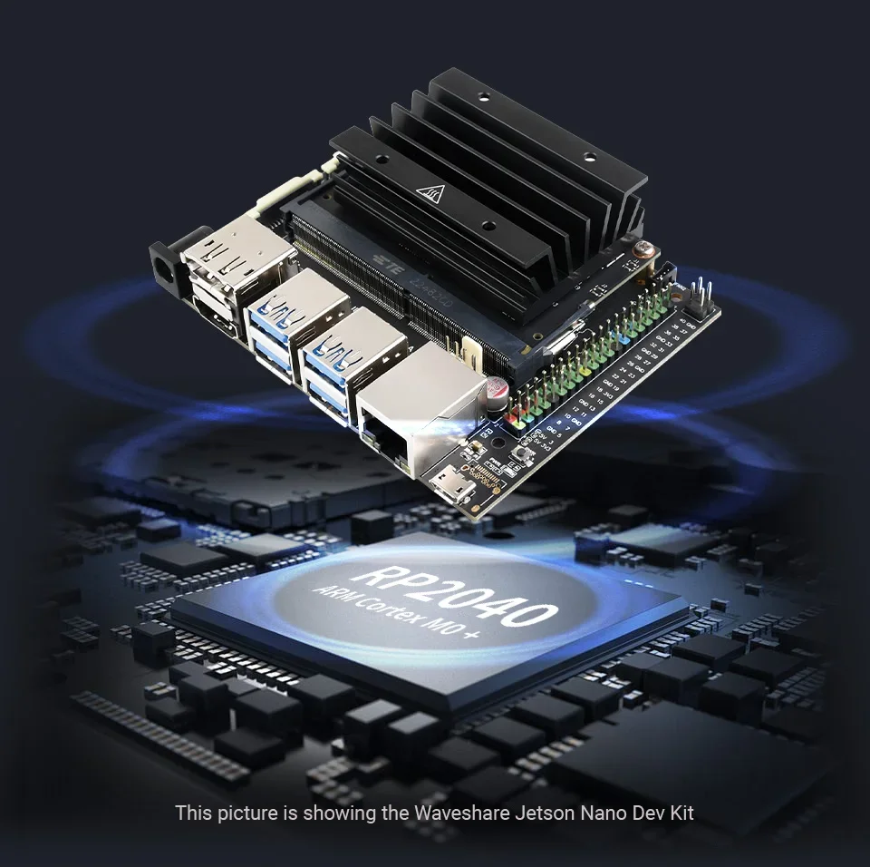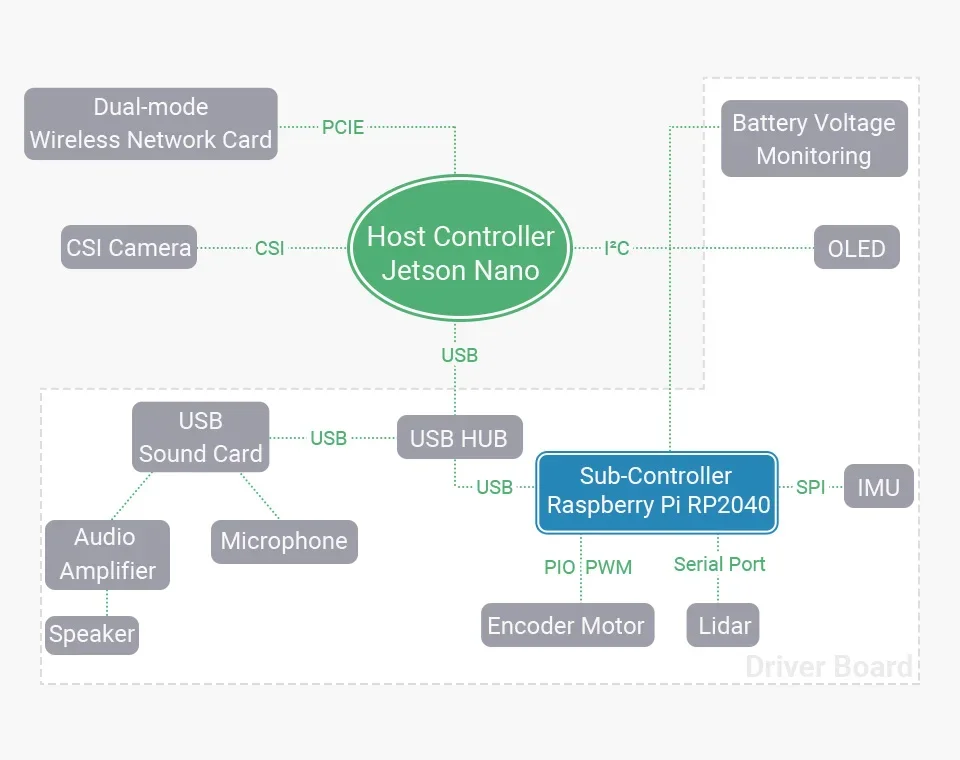El controlador principal adopta el kit Jetson Nano Dev y ofrece dos opciones de versión: el kit de desarrollo N-VIDIA Jetson Nano (B01) y el kit de desarrollo Waveshare Jetson Nano.Ambos kits tienen casi el mismo rendimiento y apariencia, excepto que el kit de dispositivo Waveshare Jetson Nano adopta una versión eMMC de 16 GB del módulo Jetson Nano.El kit Jetson Nano Dev está equipado con una memoria de 4 GB y tiene un mejor rendimiento, responsable de la inteligencia artificial (IA), el procesamiento del habla, el procesamiento visual, el mapeo y la navegación, etc.