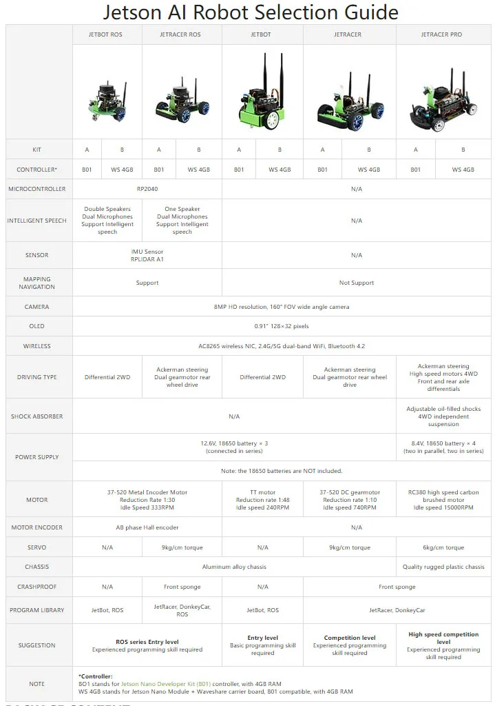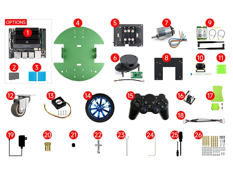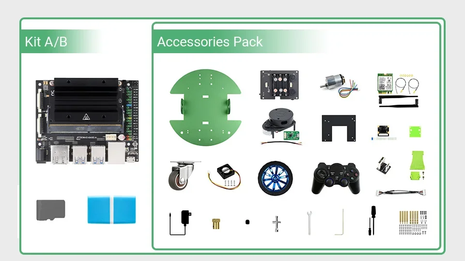 * Nota: Este producto ofrece tres opciones: Kit A, Kit B y Paquete de Accesorios.El kit Jetson Nano Dev se diferencia en el kit A y el kit B y no está incluido en el paquete de accesorios.Consulte la lista de piezas para conocer el contenido detallado del paquete.
