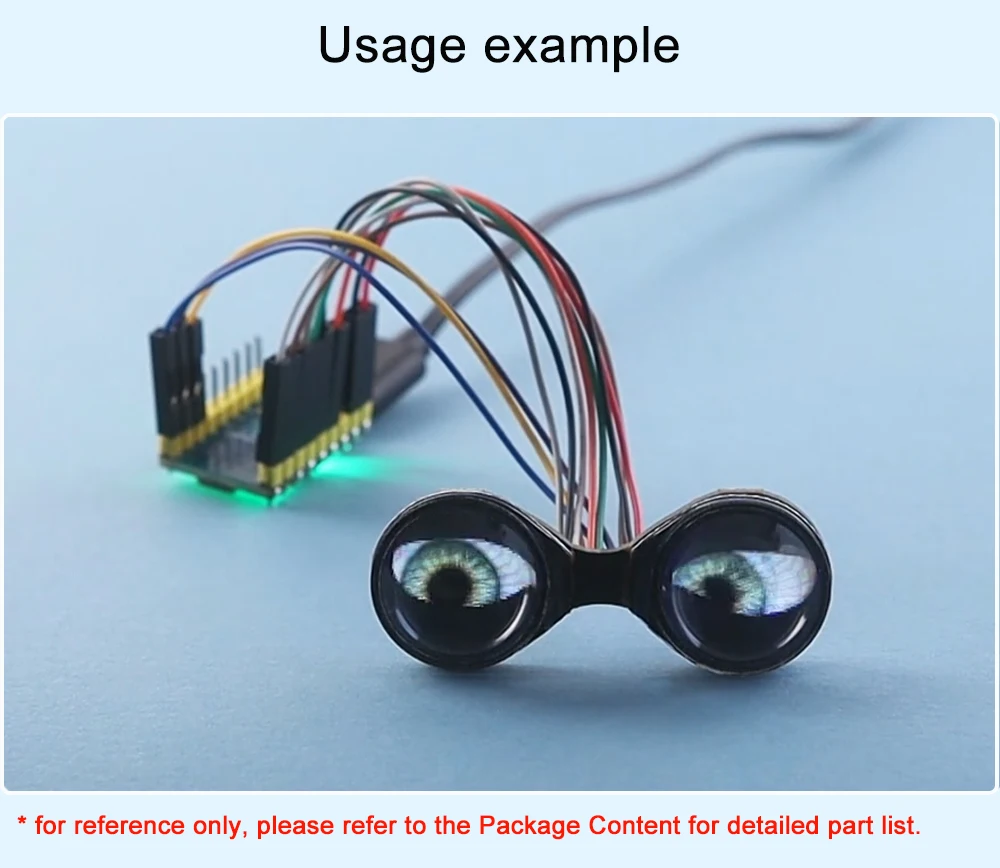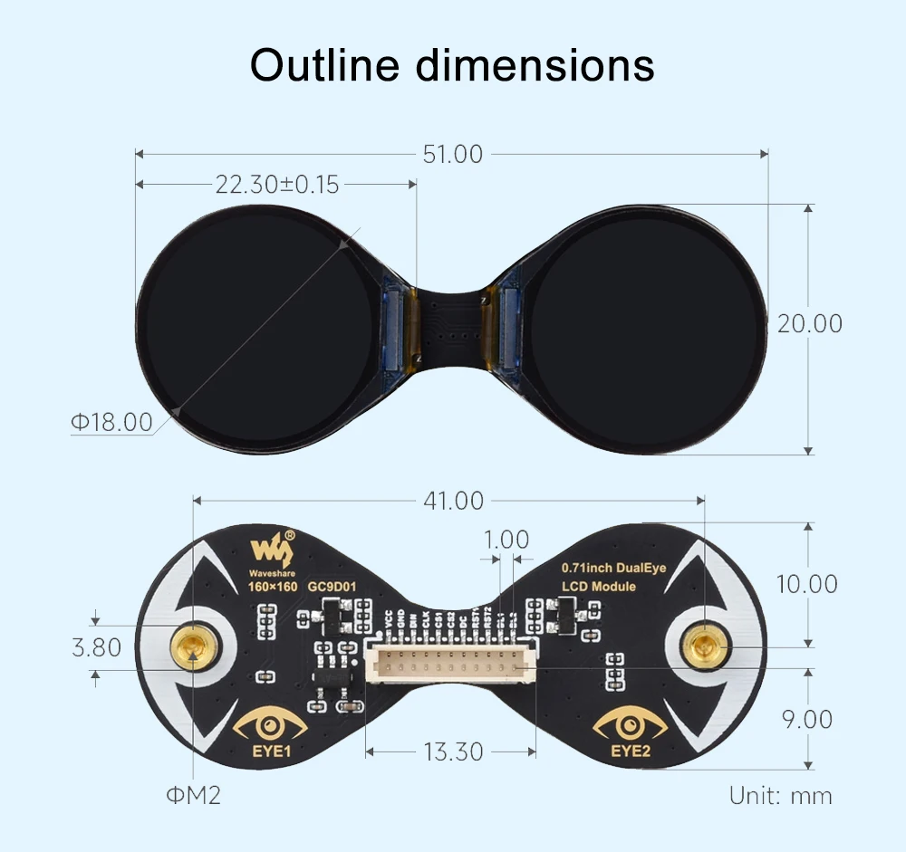 Designed for seamless integration, the 0.71inch Double Eye Round LCD Display Module comes with a SH1.0 11PIN cable and convex lenses, making it a plug-and-play solution for your projects. The lightweight module, weighing just 0.011 kg, is compact and easy to handle, allowing for versatile placement in your robot kit or other DIY projects. The module's design is not only functional but also aesthetically pleasing, with its round shape and dual eye display, providing a modern and stylish look to your creations.