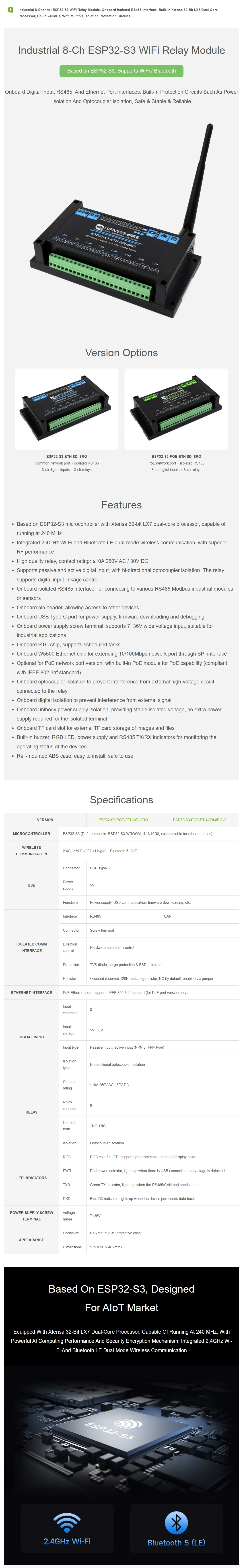 Comprar Waveshare Módulo de relé WiFi industrial ESP32-S3 de 8 canales, RS48 aislado integrado, Xtensa integrada de 32 bits LX7 de doble núcleo