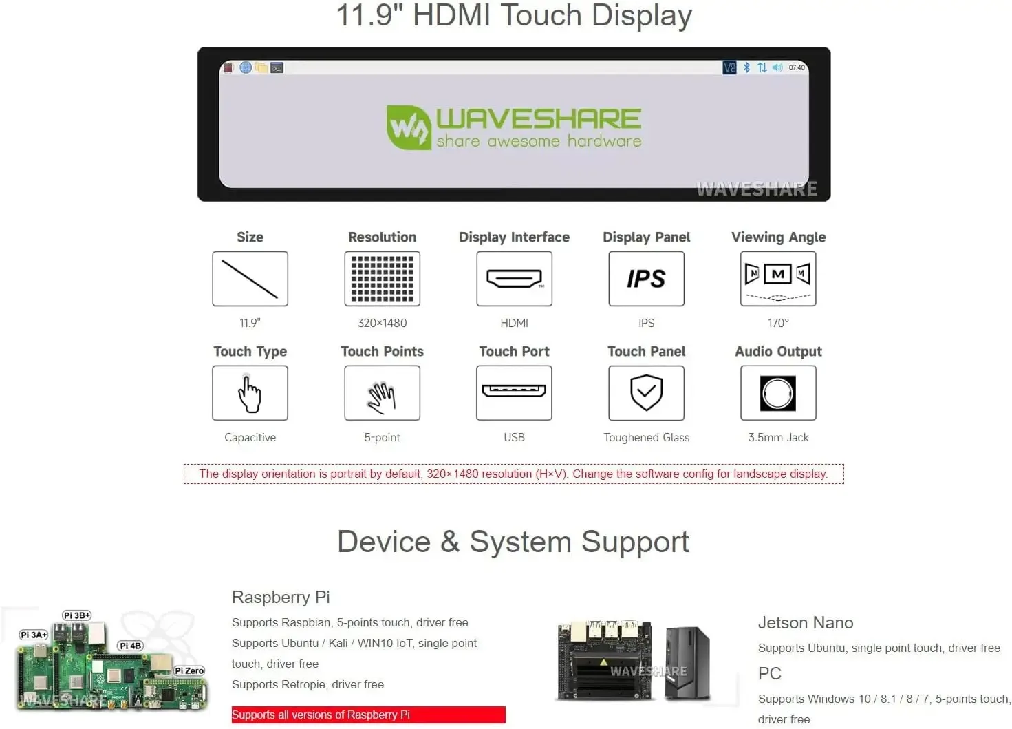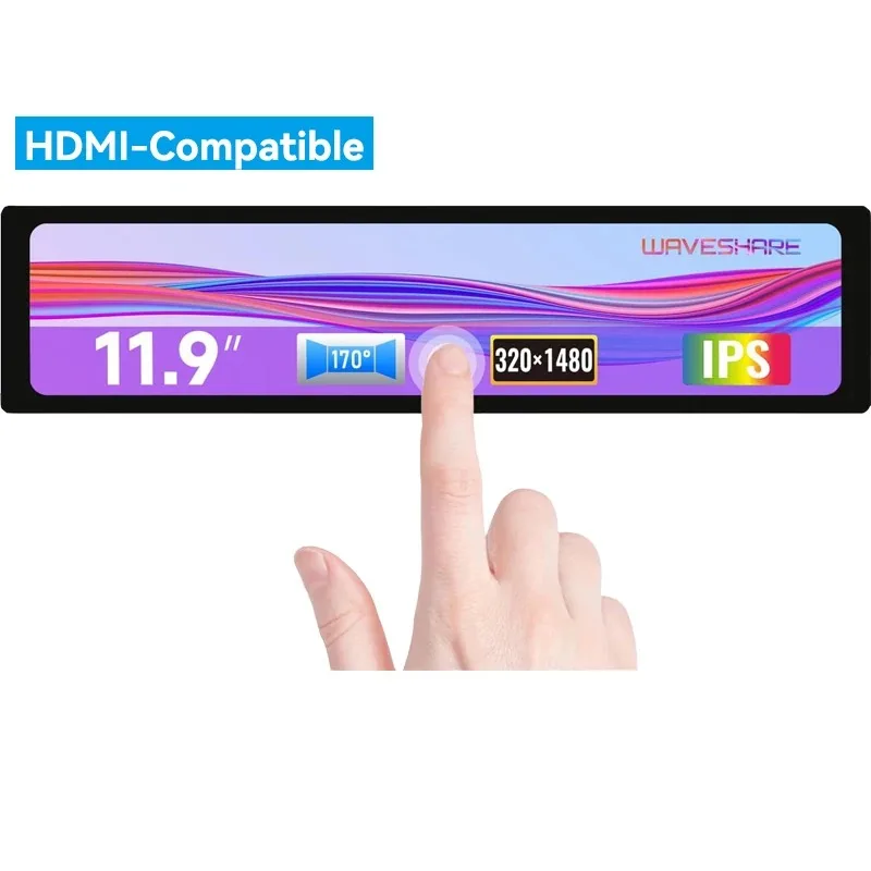 Comprar Waveshare pantalla táctil IPS de 11,9 pulgadas 320x1480 pantalla LCD Compatible con HDMI para Raspberry Pi 5/4B/3B +/3A +/Zero/Zero W/Zero 2W CM3 + 4