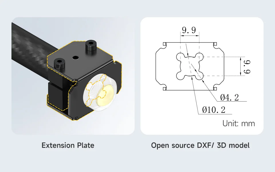 El EoAT admite varios métodos de montaje, se puede utilizar como abrazadera o como cuarto grado de libertad.Proporciona modelos DXF y 3D de código abierto para bricolaje y desarrollo secundario