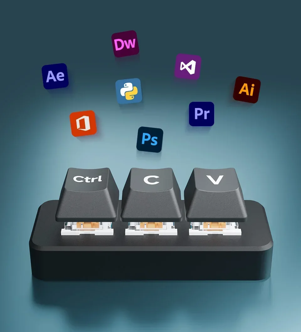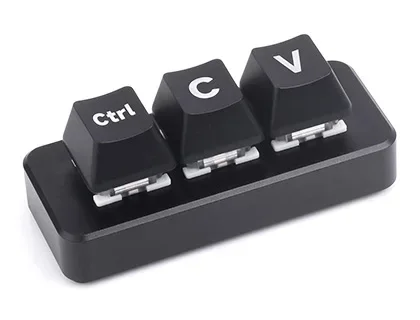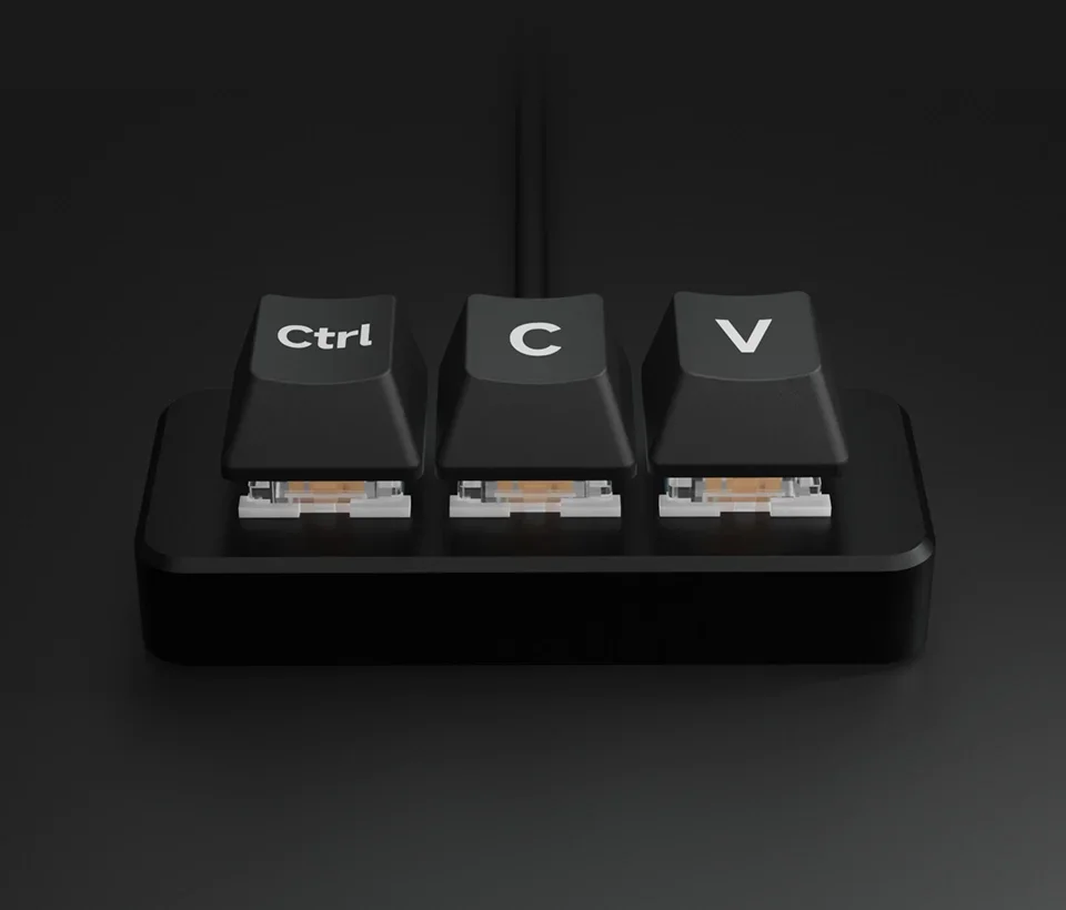 La función predeterminada de tres teclas es "Ctrl", "C" y "V", programable para otras funciones.Viene con teclas negras de dos capas sin carácter para un uso personalizado.
