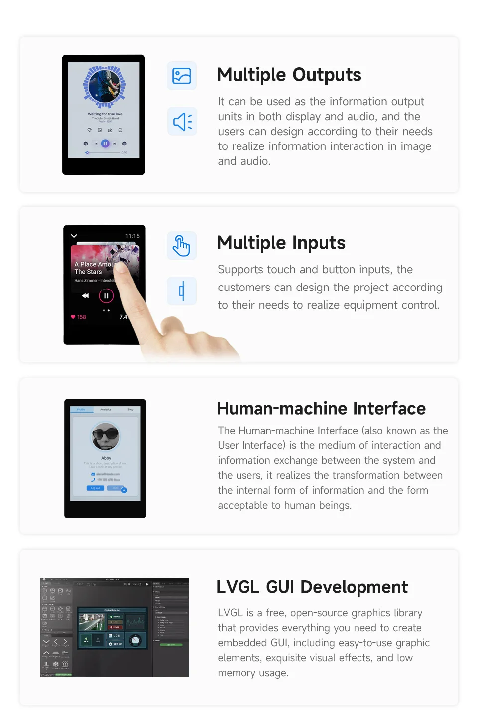 Admite la función táctil capacitiva controlada a través de la interfaz I2C para un funcionamiento flexible y una interacción de interfaz de usuario fluida, táctil de 5 puntos, con soporte de interrupción