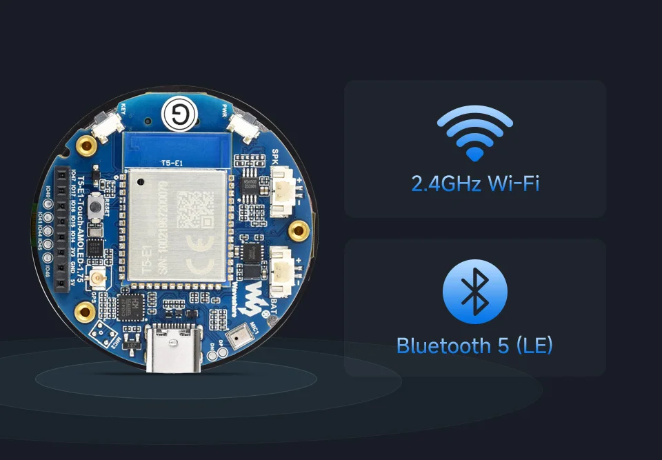 T5-E1 integra Wi-Fi de 2,4 GHz (802.11 B/G/N/Ax) con anchos de banda de 20 MHz y 40 MHz, su subsistema Bluetooth de bajo consumo admite Bluetooth 5 (Bluetooth LE)