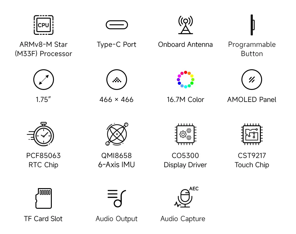 IMU integrada de 6 ejes QMI8658 (acelerómetro de 3 ejes y giroscopio de 3 ejes) para detectar postura de movimiento, conteo de pasos y otras funciones