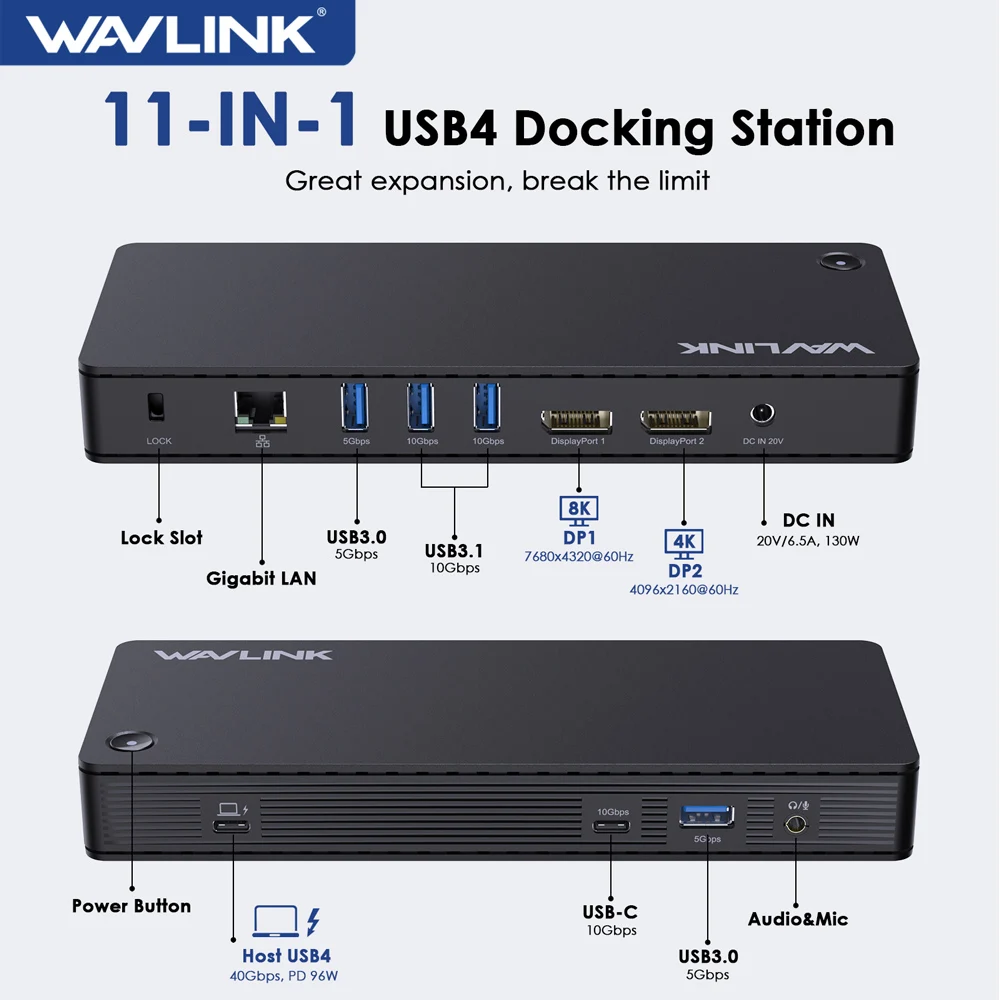 Estación de acoplamiento WAVLINK USB 4, base USB-C con pantalla 4K dual 11 en 1, 8K DP1, 4K DP2, 130 W PD IN, 10 Gbps USB3.1x3, 5 Gbps USB3.0x2, Gigabit RJ45, Plug & Play en Windows/Mac OS, Trabajar con portátiles TBT3/4
