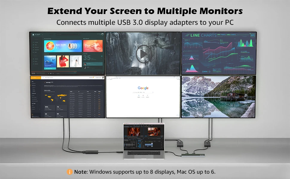 -Conecta múltiples adaptadores de pantalla USB 3,0 a su PC para extender su pantalla hasta pantallas adicionales; Windows hasta 8 pantallas, Mac OS hasta 6.