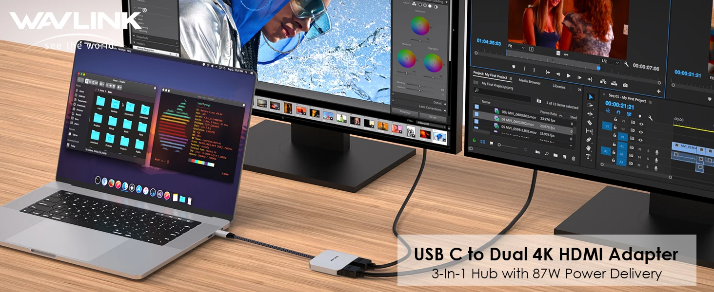 WAVLINK USB C a Dual HDMI Splitter 4K @ 60Hz, Adaptador HDMI 3 en 1 con Entrega de Potencia de 87W, Adaptador de Monitor Dual Powered HDMI Hub para MacBook Pro/Air, portátiles Dell XPS, HP, Lenovo, Thunderbolt 3/4