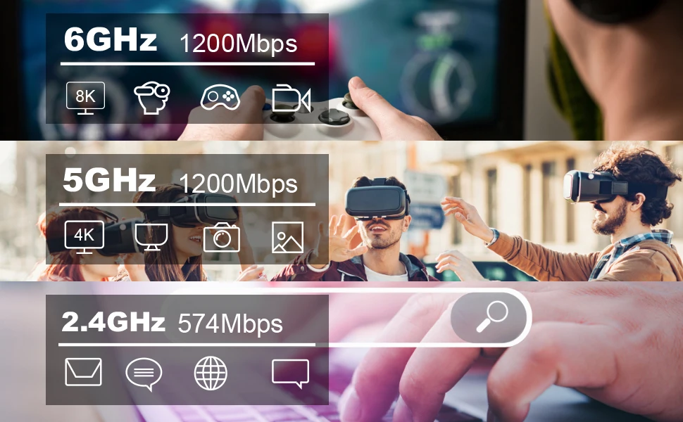 Velocidad de transmisión: 2,4 GHz: 574 Mbps 5 GHz: 1200 Mbps 6 GHz: 1200 Mbps