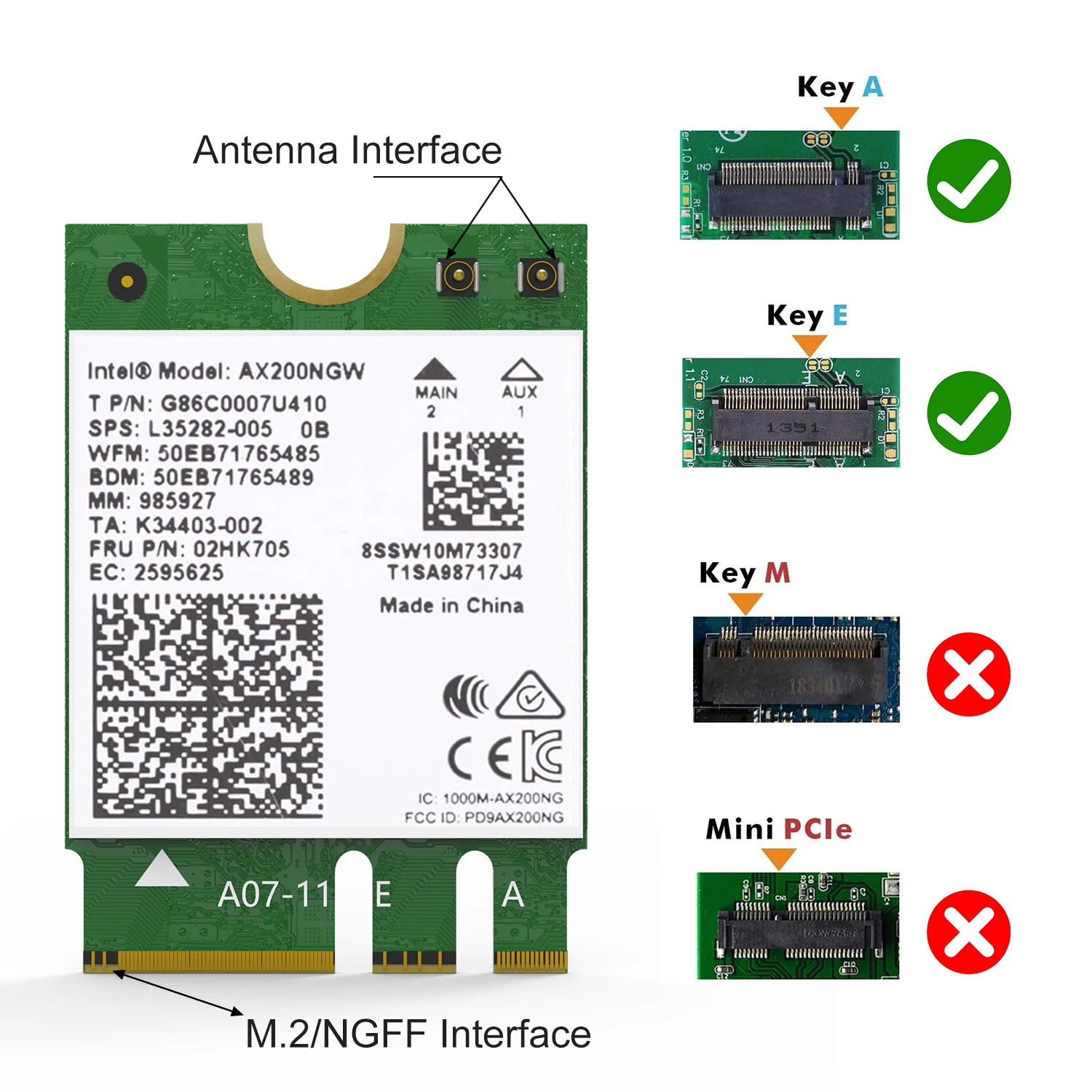1.Esta tarjeta wifi para computadora portátil está disponible para computadoras portátiles con una ranura M.2 (tecla A o E) o computadoras de escritorio con una ranura M.2 impresa con "wifi".