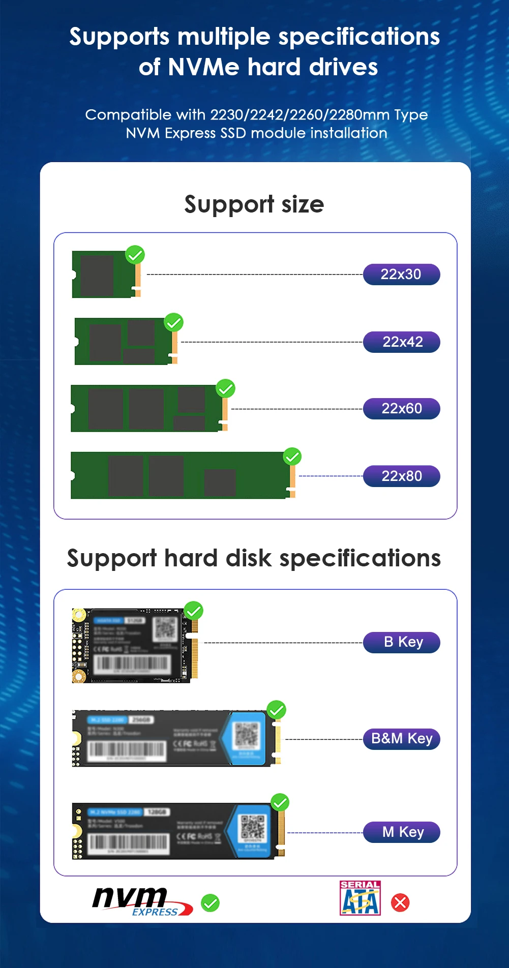 • Diseño industrial único con la mejor tecnología de convección de aire para disipar el calor.• Cumple con la especificación USB 3,1 Gen 2, la interfaz ofrece una velocidad de transferencia de hasta 10Gbps.• Cumple con PCIe Gen3 x 2 R3.1a y NVM Express R1.3.• Cumple con UASP Rev.4 y admite el ajuste al SSD.• Conversión o copia de seguridad de alta velocidad de los datos de NVME SSD a través del puerto USB C.• Compatible con la instalación del módulo SSD NVM Express de 2230/2242/2260/2280mm.• Portátil, Plug & Play, no necesita controlador y es compatible con Windows y Mac