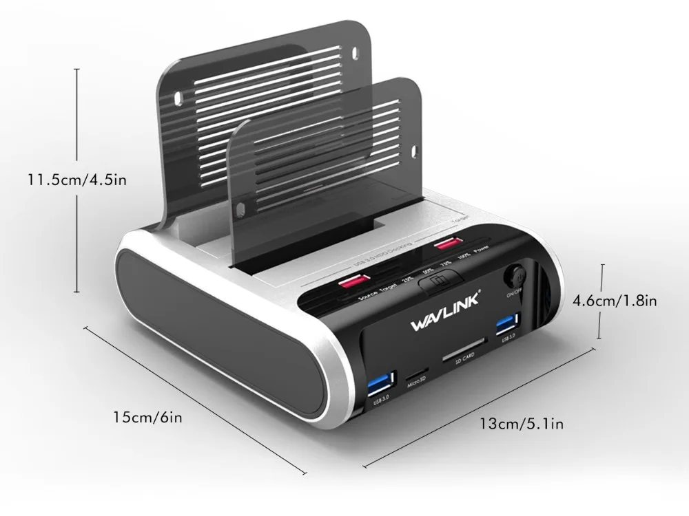 Wavlink-da vida a la tecnologíaLa estación de acoplamiento Wavlink Dual Bay con centro de carga rápida y lector de tarjetas proporciona una solución perfecta para hacer copias de seguridad y procesar datos de TI, datos de procesamiento por lotes, formateo, transferencias de archivos, recuperación de datos, carga, etc.Carga rápida de 2 puertos. Cada uno hasta 5V/2.4A.La base cuenta con un concentrador USB 3,0 de 4 puertos integrado que le permite conectar cualquier otro periférico USB a su PC. Los 2 puertos de carga rápida cargan iPads y otros dispositivos móviles de manera tan efectiva como a través de un enchufe de pared, cada uno de hasta 5V/2.4A.2 puertos SuperSpeed USB 3,0 con UASPCon la conectividad USB3.0 SuperSpeed, la velocidad de transferencia de datos podría alcanzar hasta 5 gbps, 20% más rápido que el USB 3,0 tradicional con protocolo de transferencia UASP, pasamos menos tiempo para sincronizar datos masivos.Función de ClonSimplemente presione el botón OTB para operar la función de clonación y copiar datos masivos sin PC. El proceso de clonación mostrará claramente 25%, 50%, 75%, 100% a través de luces LED. Puede estar seguro de hacer otras cosas.Lector de tarjetas SDUtilice el lector de tarjetas para acceder fácilmente a los datos en su tarjeta de memoria SD, SDXC o SDHC entre su ordenador y la Cámara, smartphone, reproductor de música, tableta, unidad flash y disco duro externo.Recordatorio cálido:---- El puerto de carga solo para una carga rápida, sin función USB.---- Haga una copia de seguridad de los archivos en el disco duro de destino antes de clonar.----- El disco de destino debe ser más grande que el disco de origen.---- Para evitar errores de transferencia de datos, sobrecalentamiento y daños en el dispositivo, asegúrese de que no haya celdas de controlador defectuosas.---- Para evitar la pérdida de datos, no retire ni inserte unidades cuando una unidad esté funcionando en la estación de acoplamiento. Apaga la estación de acoplamiento antes de quitarla.---- Lea atentamente el manual antes de usar la función de clonación.--- Esta base no es compatible con ordenadores Mac con conjuntos de chips de la serie M1, incluidos M1, M1 Pro y M1 Max.