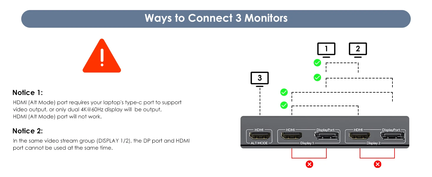 -Confirme que el puerto tipo C de su computadora portátil admite carga y salida de video, o la función de carga del host de la estación de acoplamiento y HDMI (Alt. Modo) es posible que el puerto no funcione.