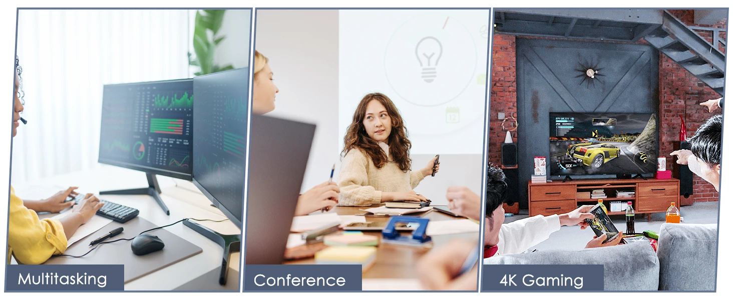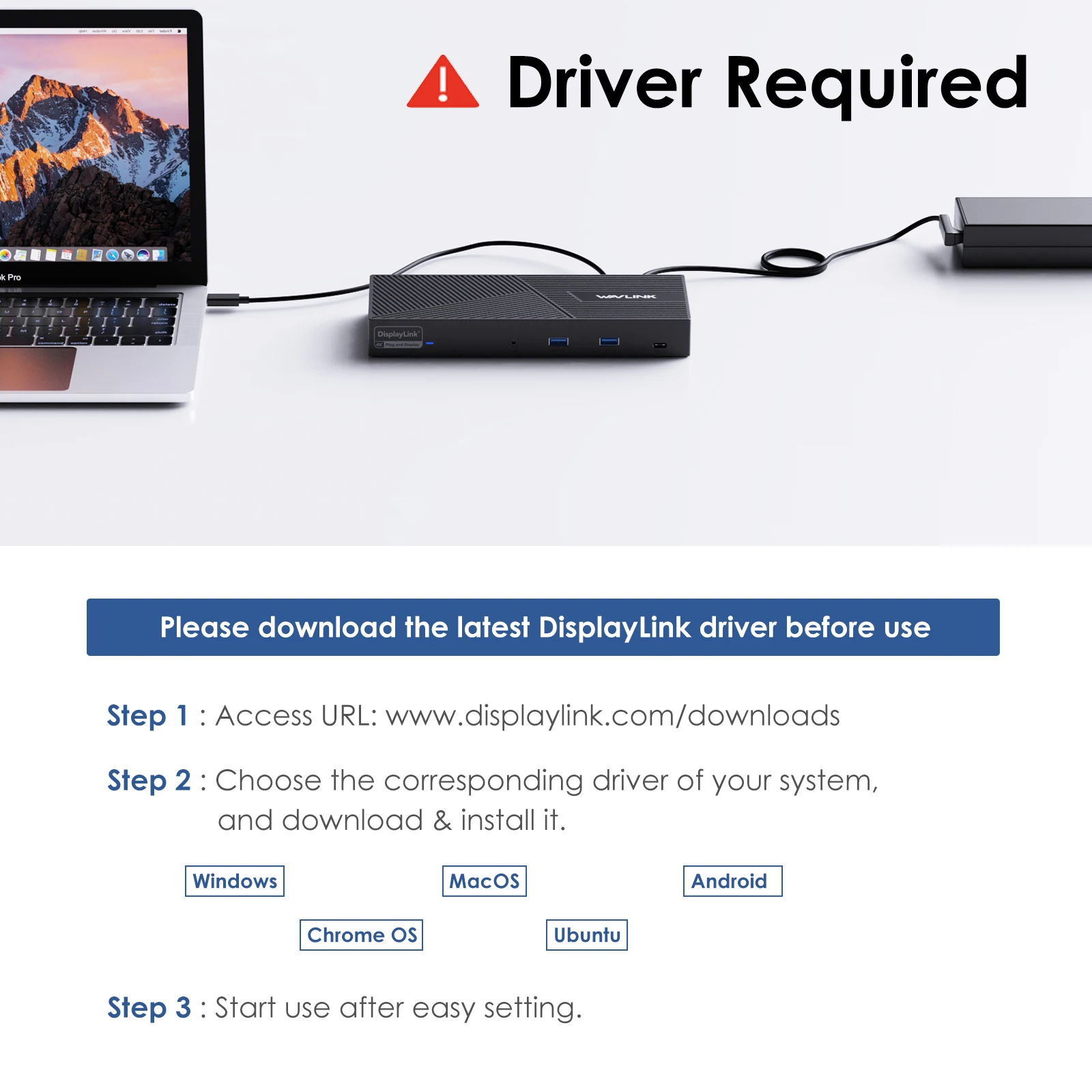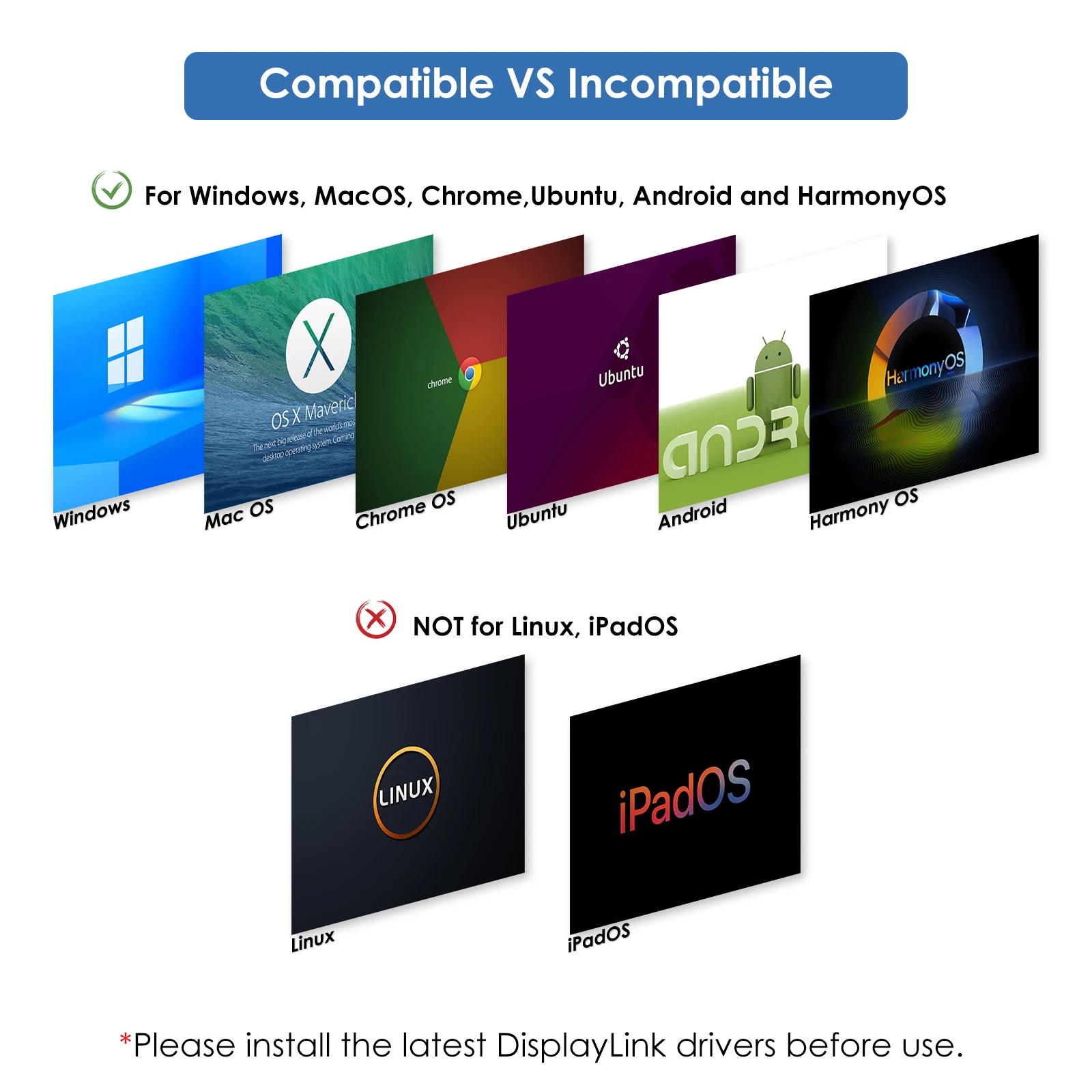 -Siga las instrucciones para descargar el último controlador de DisplayLink del sitio web oficial antes de usarlo. SOLO Plug and Play para Chrome OS, Windows 10/11.
