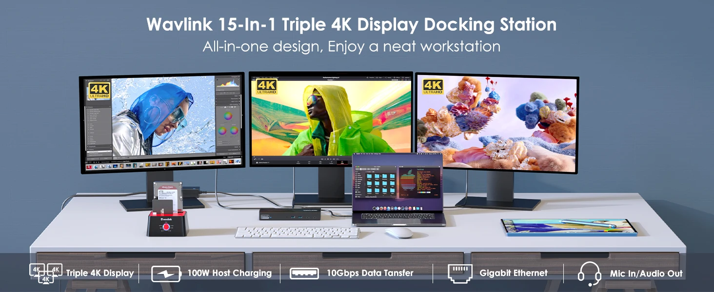 Estación de acoplamiento Wavlink 15-IN-1 Triple 4K Ultra HD Displaylink con 3xHDMI, 2xDisplayPort y carga PD de 100W