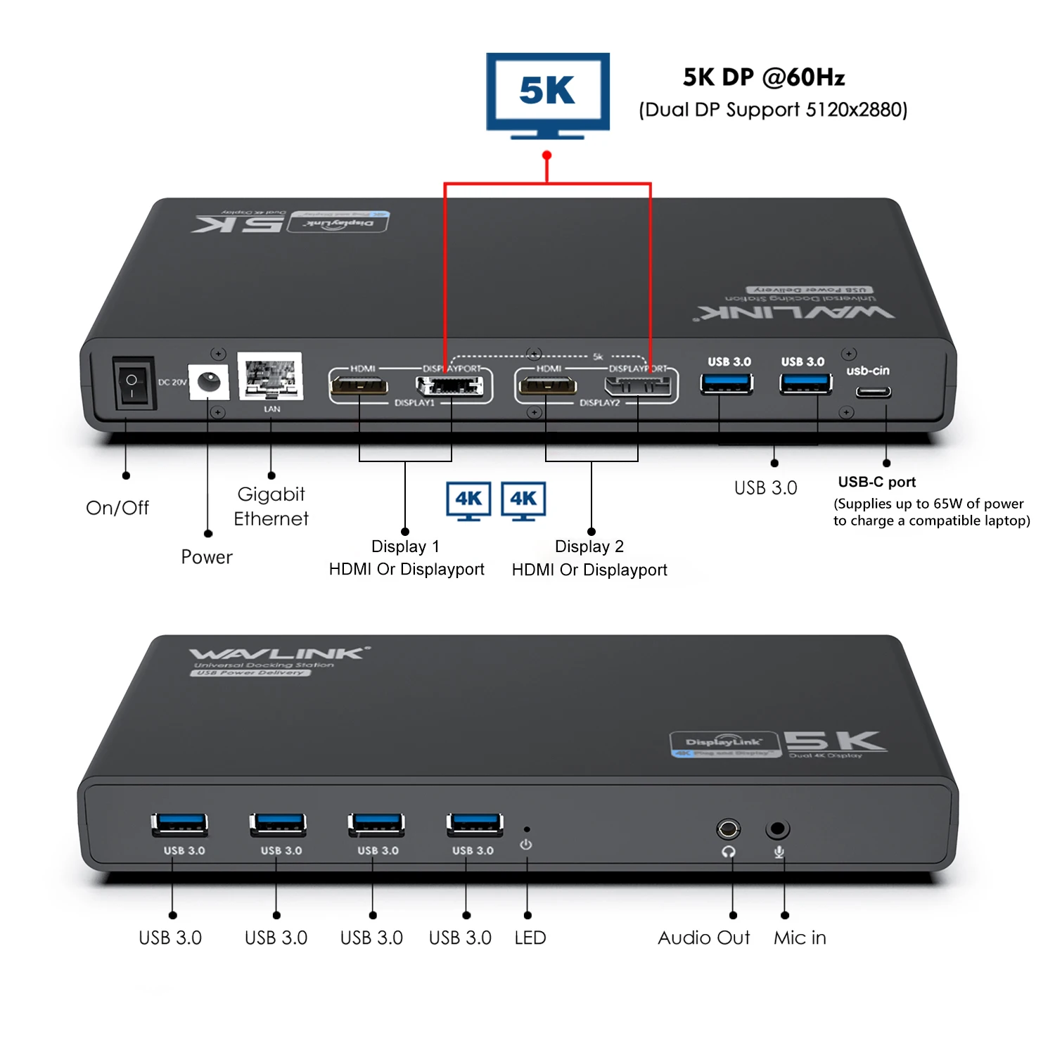 Estación de acoplamiento de pantalla múltiple WAVLINK Ultra HD con carga de computadora portátil de 65W para Windows tipo C y tipo A o Mac OS, Single 5K @ 60Hz o Dual 4K @ 60Hz,(2X 4K HDMI,2X puertos de pantalla, 3X puertos USB3.0, puertos de 2X, Gigabit Ethernet, audio y micrófono)