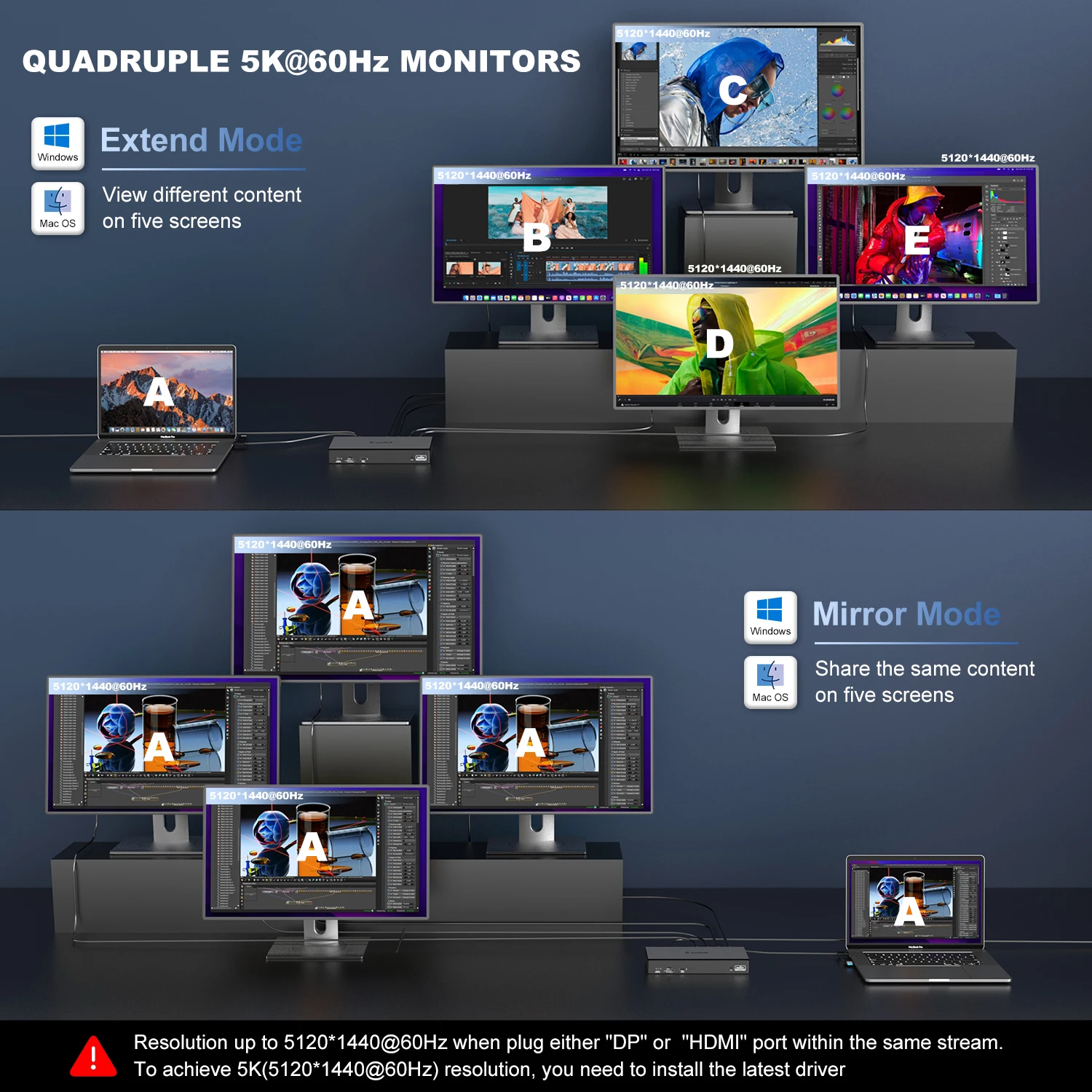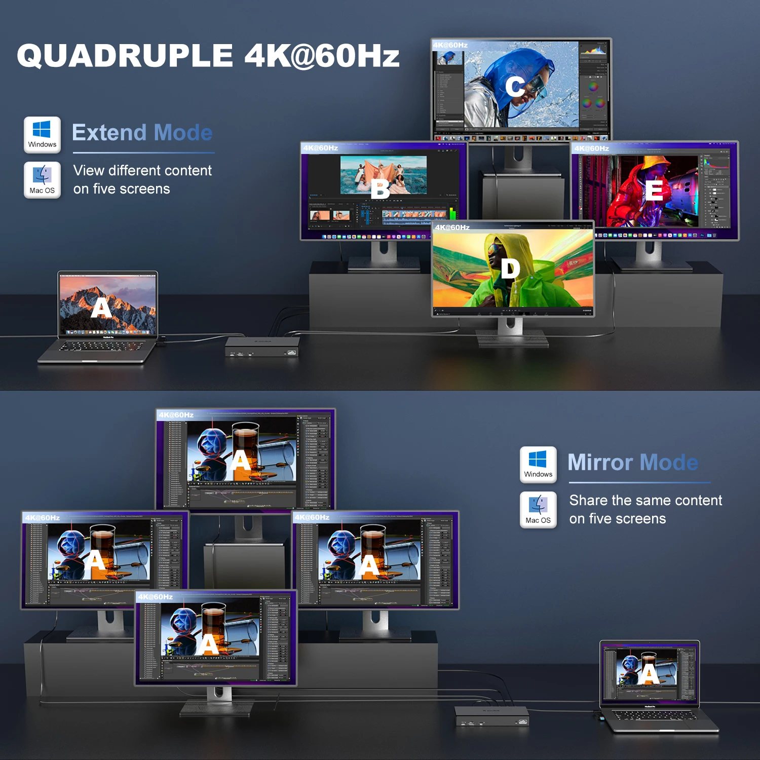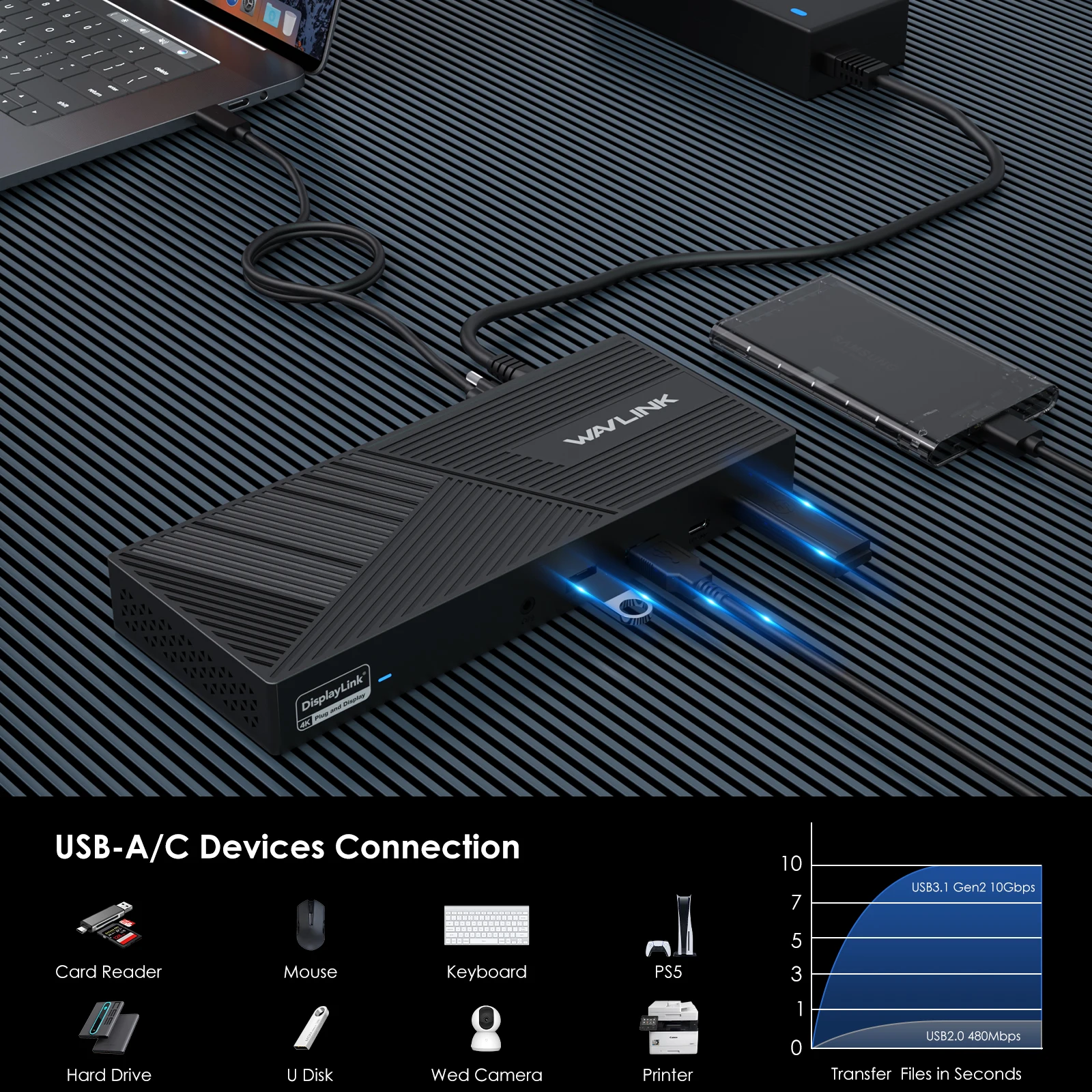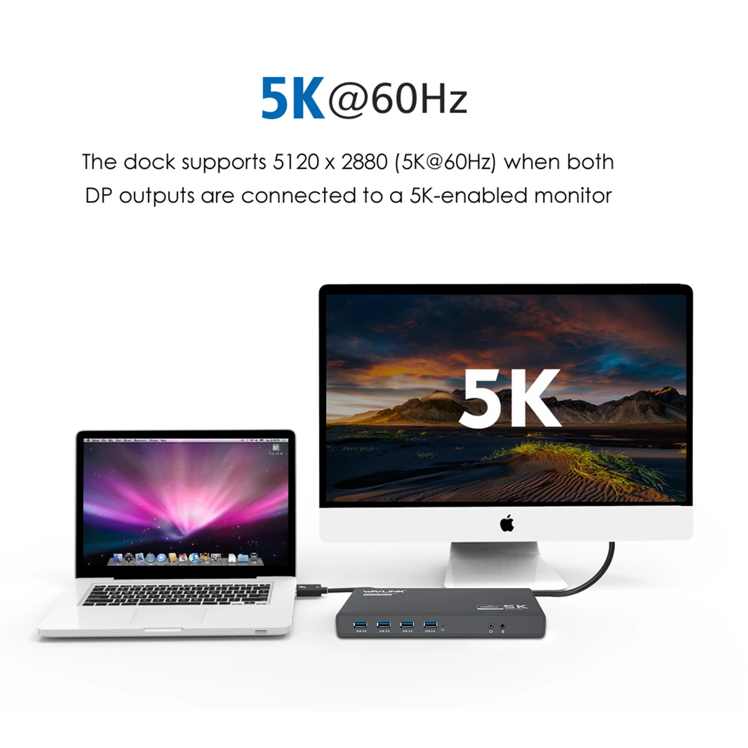 Estación de acoplamiento Wavlink USB C con entrega de energía, carga de 60W, doble 4K (4096 × 2160 @ 60HZ), individual 5K (5120 × 2880 @ 60HZ), dos puertos, para Windows y Mac OS
