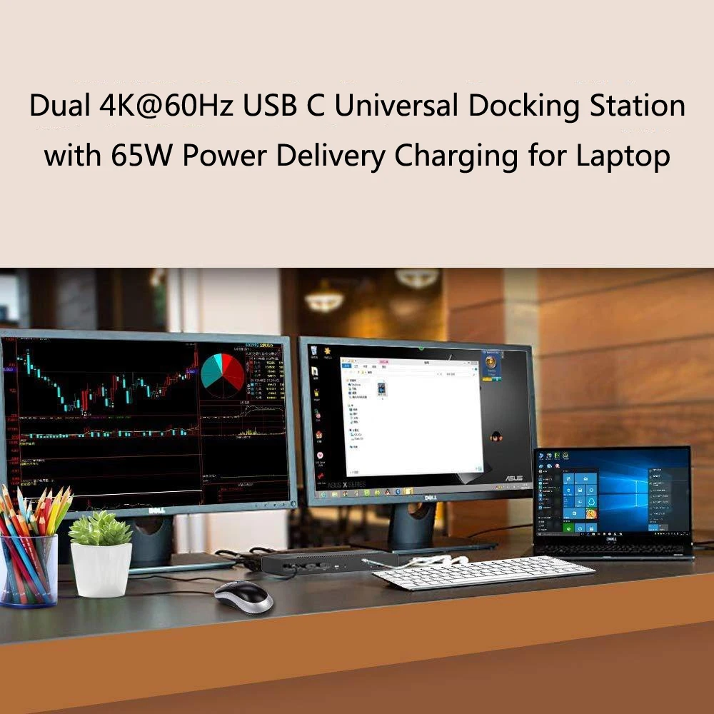Estación de acoplamiento Wavlink USB C Dual 4K con carga para portátil de 65W Base de pantalla múltiple Ultra HD con 2 x HDMI y DisplayPort, Gigabit Ethernet, USB C, 6 × USB 3,0, Audio, Mic, compatible con Windows, Mac OS