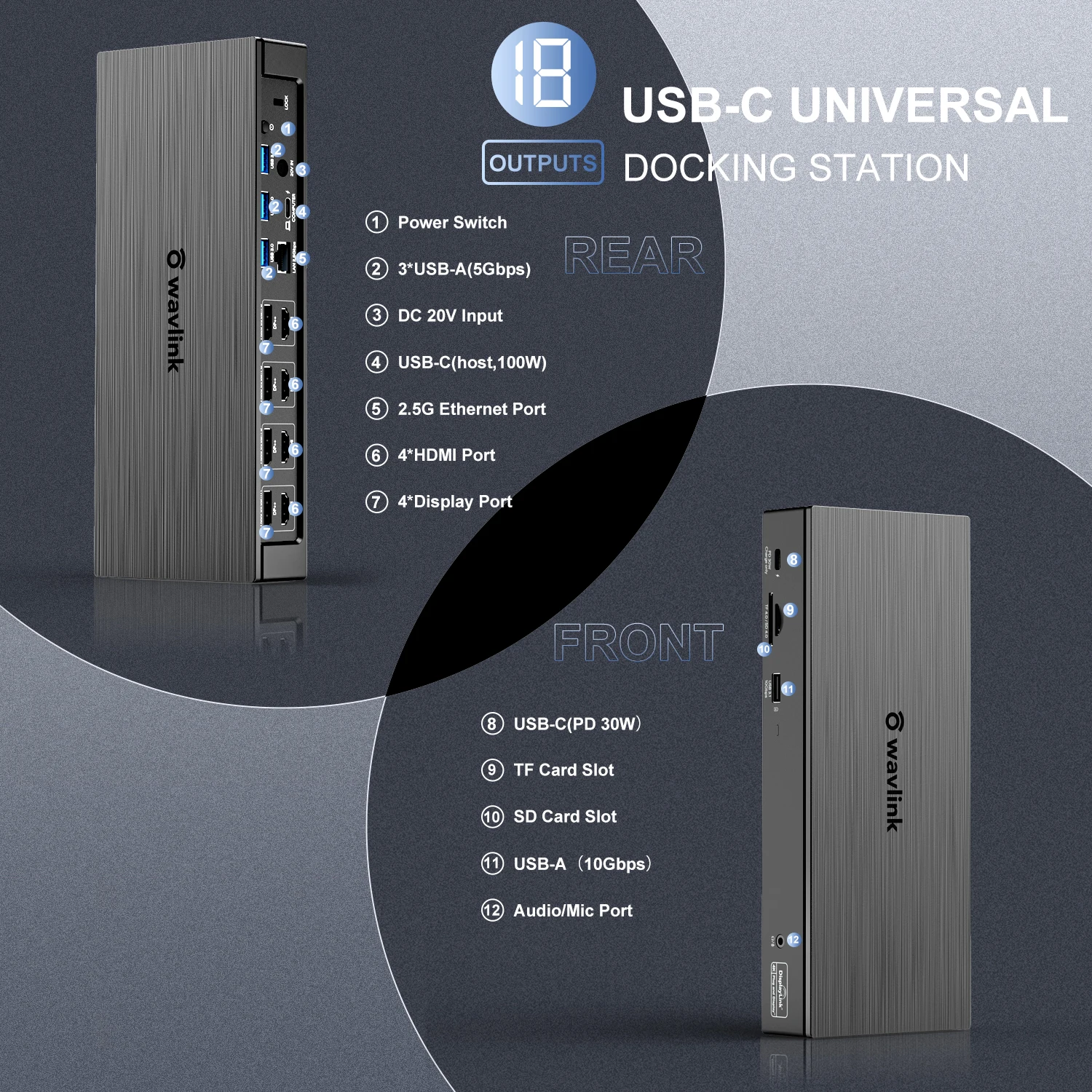 Wavlink 5K Pantalla Cuádruple Estación de Acoplamiento Universal, 18 en 1 Base de Ordenador Portátil de 18 en 1 (3 Thunderbolt) Compatible para MacBook y Windows con 4 DP, 4 HDMI, 2,5G Ethernet, PD de 100W (Host), 3 USB3.0, 1 USB3.1, SD/TF, Audio/micrófono, 1 USB-C(PD30W, sin datos)