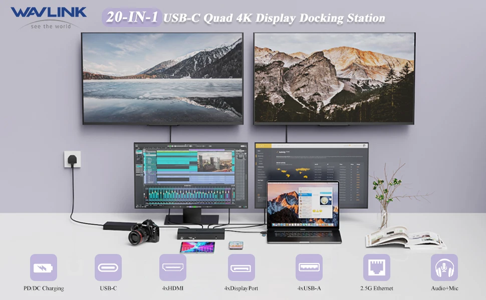 Estación de acoplamiento universal de nivel empresarial Wavlink 19/20-In-1, pantalla cuádruple de 4K a 60Hz, base universal para MacBook y Windows con entrega de potencia máxima de 100W/carga de CC de 100W, dual 5K @ 60Hz (para Windows 10), base Displaylink con 4xDisplay Port (1,2), 4xHDMI (2,0), 2,5G Ethernet