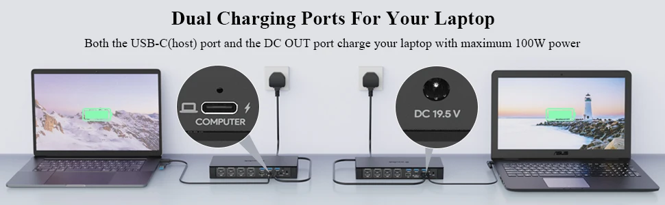 -Ofrece entrega de energía USB de 100W en PD 3,0, puede alimentar computadoras portátiles y otros periféricos a través de su base. Asegurándose de que su computadora portátil cumpla con la carga USB PD y admita una potencia de carga de 100W.