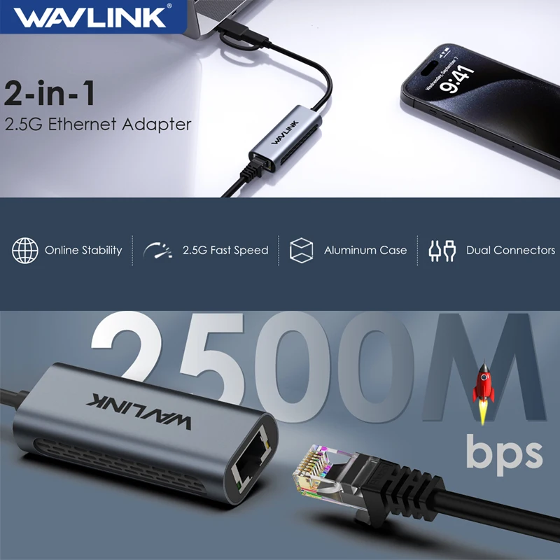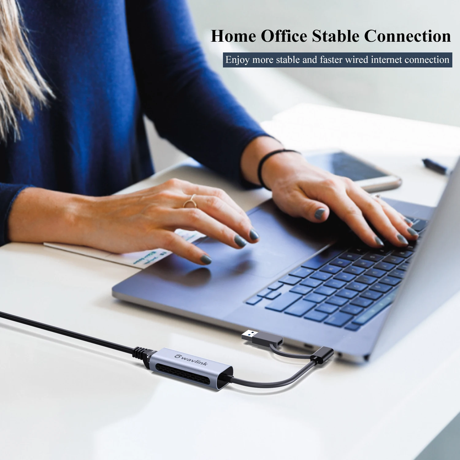 Adaptador Ethernet Wavlink 2 en 1 2,5G USB-C y USB 3.0 Compatible con computadora portátil USB C/Thunderbolt 3 o USB 3.0, adaptador USB-A portátil de aluminio y tipo C a RJ45 para Mac Windows Linux