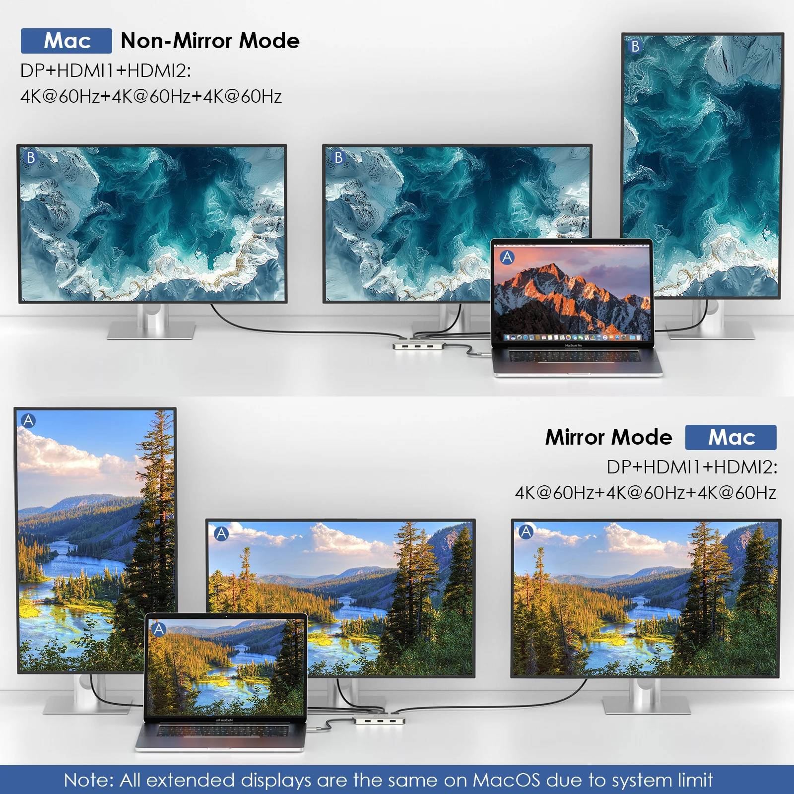 -Windows se extiende a tres pantallas diferentes (ABCD); Mac se extiende a una pantalla (ABBB) diferente mientras duplica el contenido de las demás.