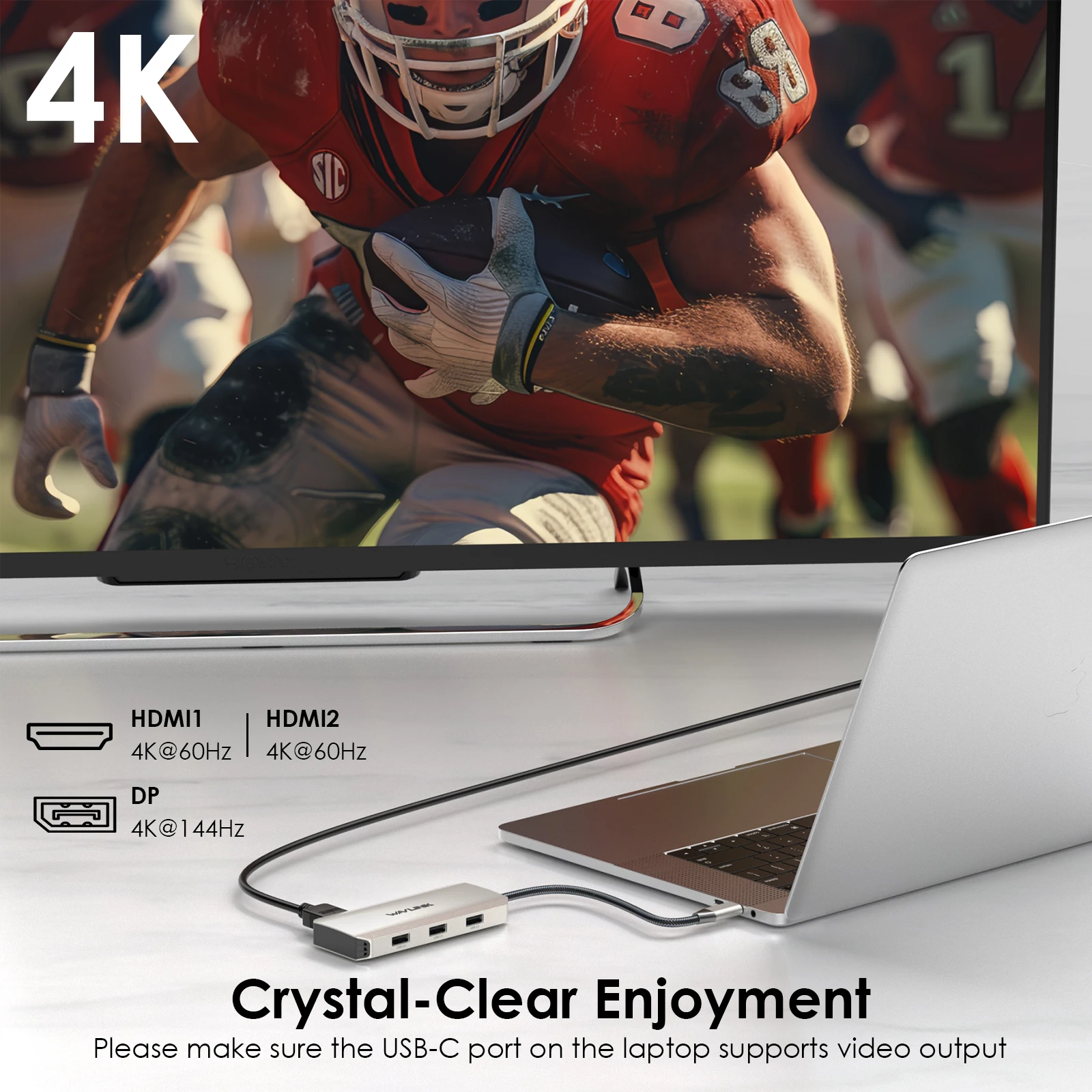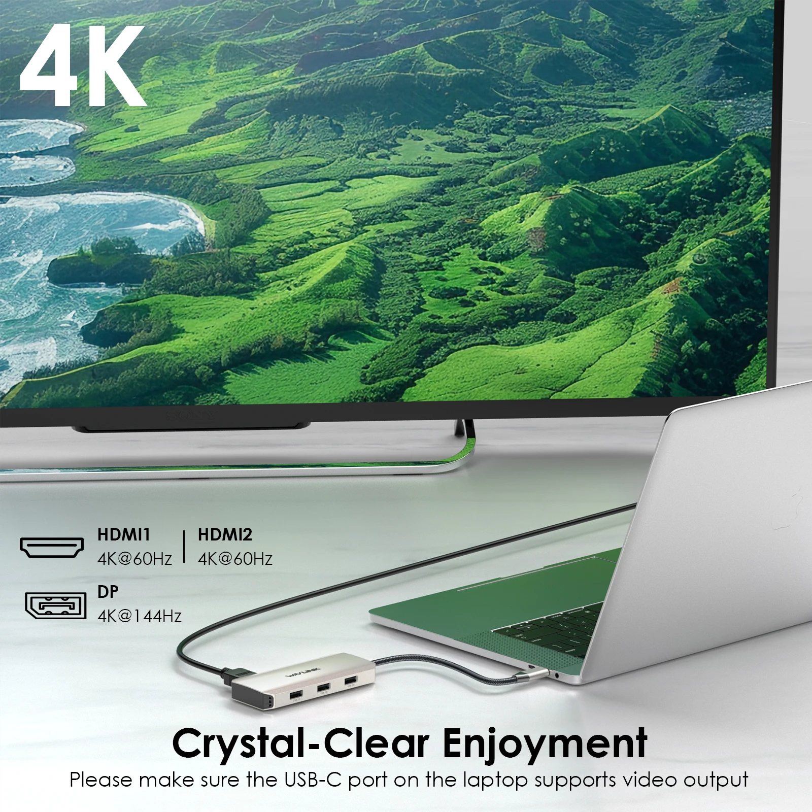 2.Puertos (7 en 1): 1x DisplayPort (4K@144Hz), 2x HDMI (4K@60Hz), 1x entrada PD (100W), 3 x USB2.0-A (480Mbps)
