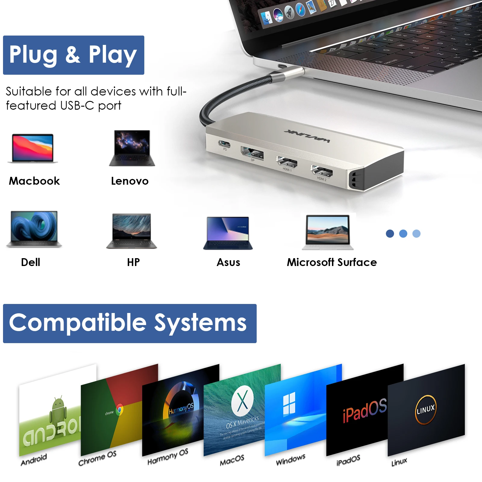 WAVLINK Triple Display USB C Dock 7 en 1 con suministro de energía de 95 W