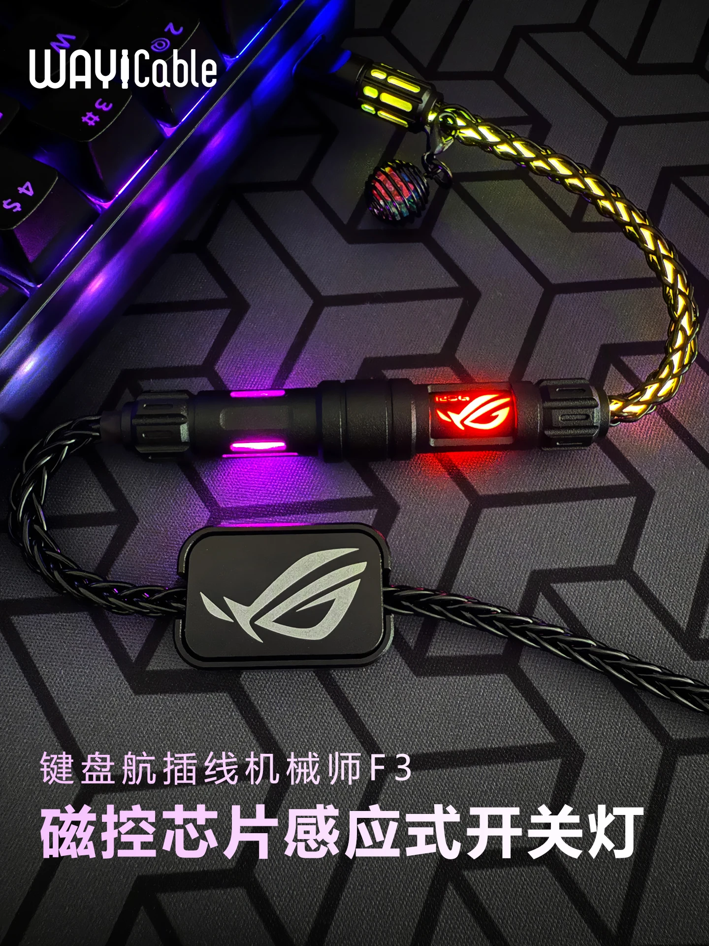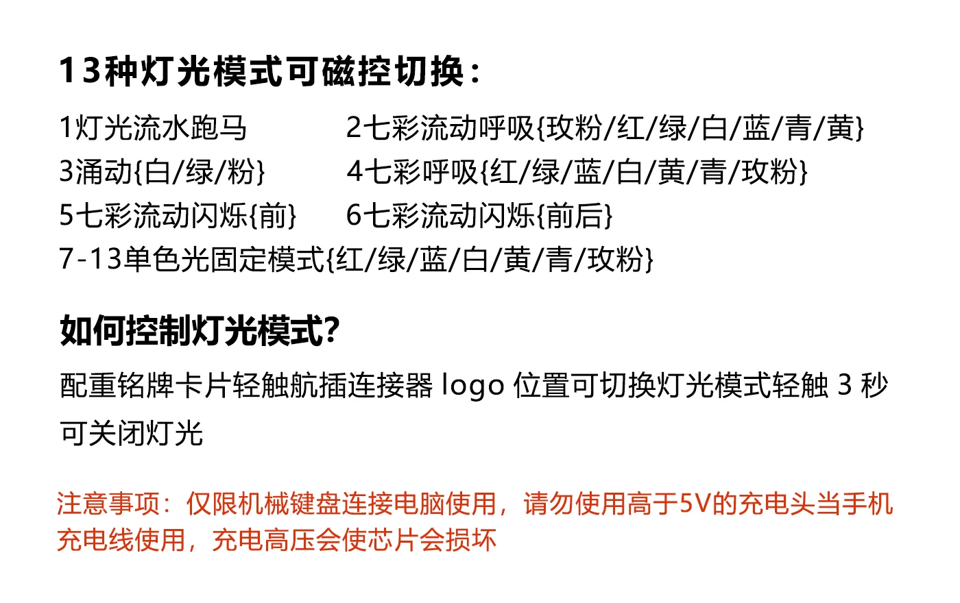 WAYI-Conector de navegación de cobre y cristal único, serie mecánica Devil, interruptor magnético para juegos 8K, Cable de teclado con enchufeLuz del interruptor de inducción del chip del magnetrón Se pueden cambiar 13 modos de iluminación mediante control magnético: 1.Carreras de caballos que fluye ligeramente 2 aliento colorido que fluye {rosa/rojo/verde/blanco/azul/azul/amarillo} 3 crecientes {blanco/verde/rosa} 4 aliento colorido {rojo/verde/azul/blanco/amarillo/azul/rosa rosa 】 5 Brillo colorido que fluye {delantero) 6 Brillo colorido que fluye {delantero y trasero) 7-13 Modo fijo monocromático {Rojo/Verde/Azul/Blanco/Amarillo/Azul/Rosa Rosa] ¿Cómo controlar el modo de iluminación? La tarjeta de identificación de peso se puede tocar ligeramente para cambiar el modo de luz tocando la posición del logotipo del conector del enchufe de aviación.Se puede tocar ligeramente durante 3 segundos para apagar la luz. Atención: Sólo para uso con un teclado mecánico conectado a una computadora.No utilice un cabezal de carga con un voltaje superior a 5 V como cable de carga de un teléfono móvil.El alto voltaje de carga puede dañar el chip.