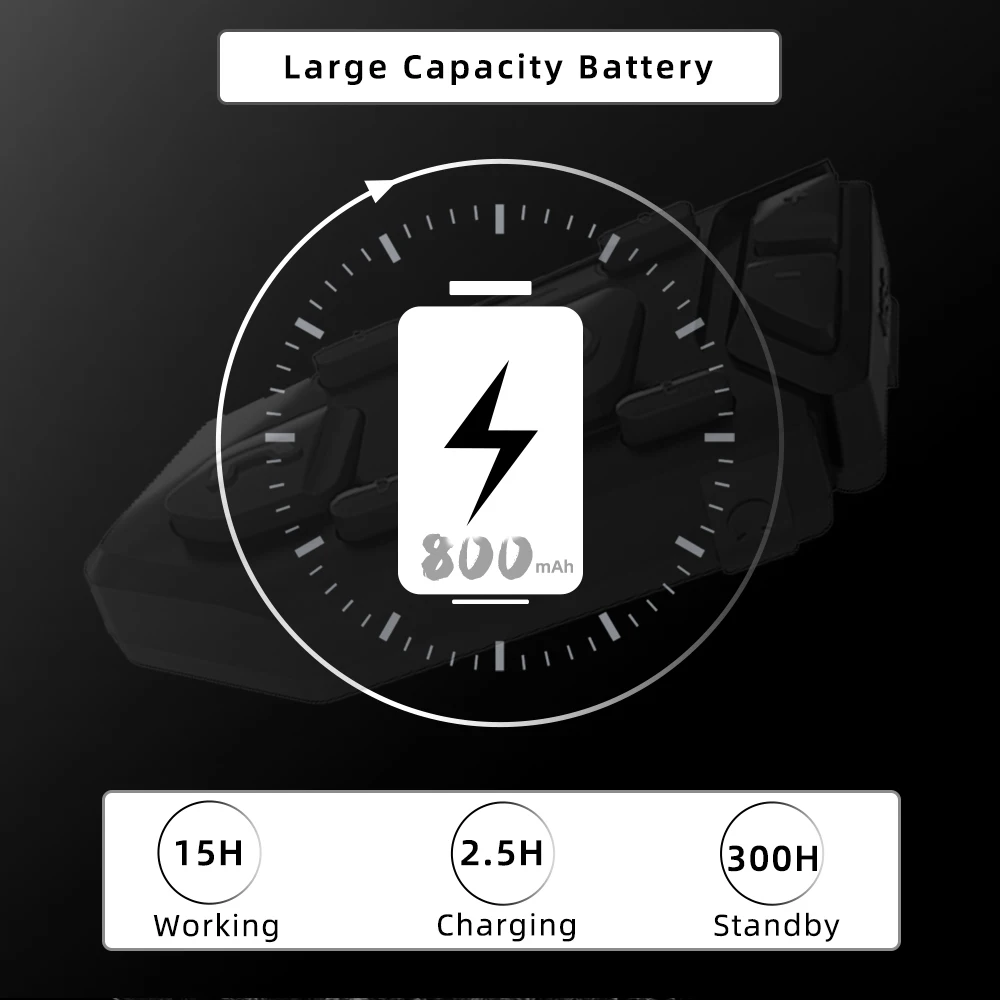 【Tiempo de trabajo】: sistema de comunicación de motocicleta R6S batería de litio incorporada de 800mAh con interfaz tipo C, tiempo de carga solo 2,5 H, tiempo de conversación continua 15h, espera 300H