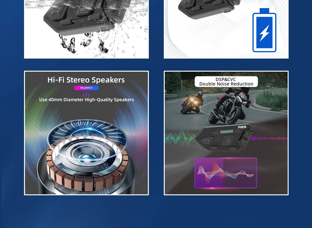 【Sonido claro】: El intercomunicador de motocicleta R6S está equipado con altavoces duales independientes con tecnología avanzada de reducción de ruido, incluso si la velocidad de su vehículo alcanza los 100 km/h, no afectará la comunicación con sus compañeros